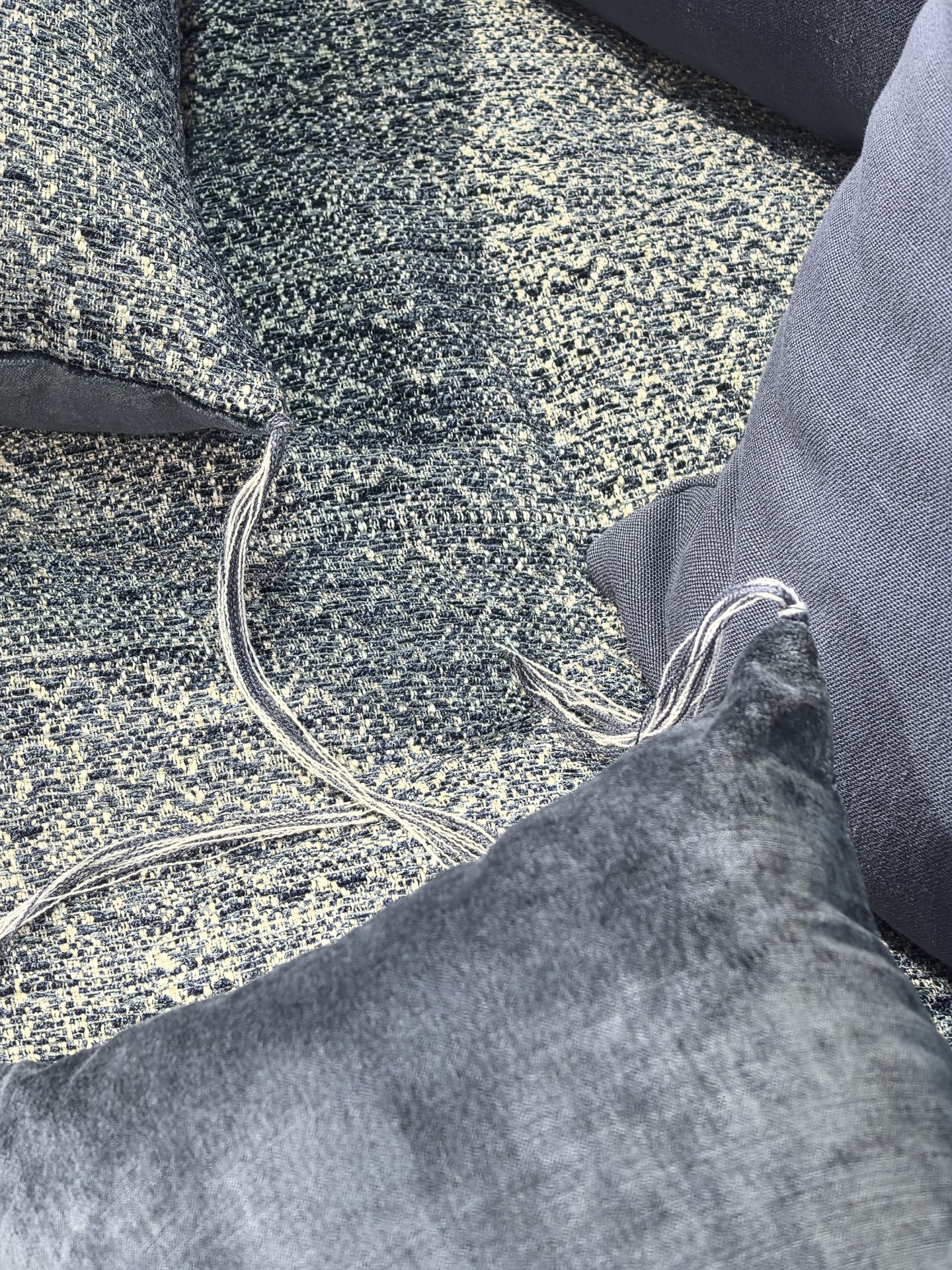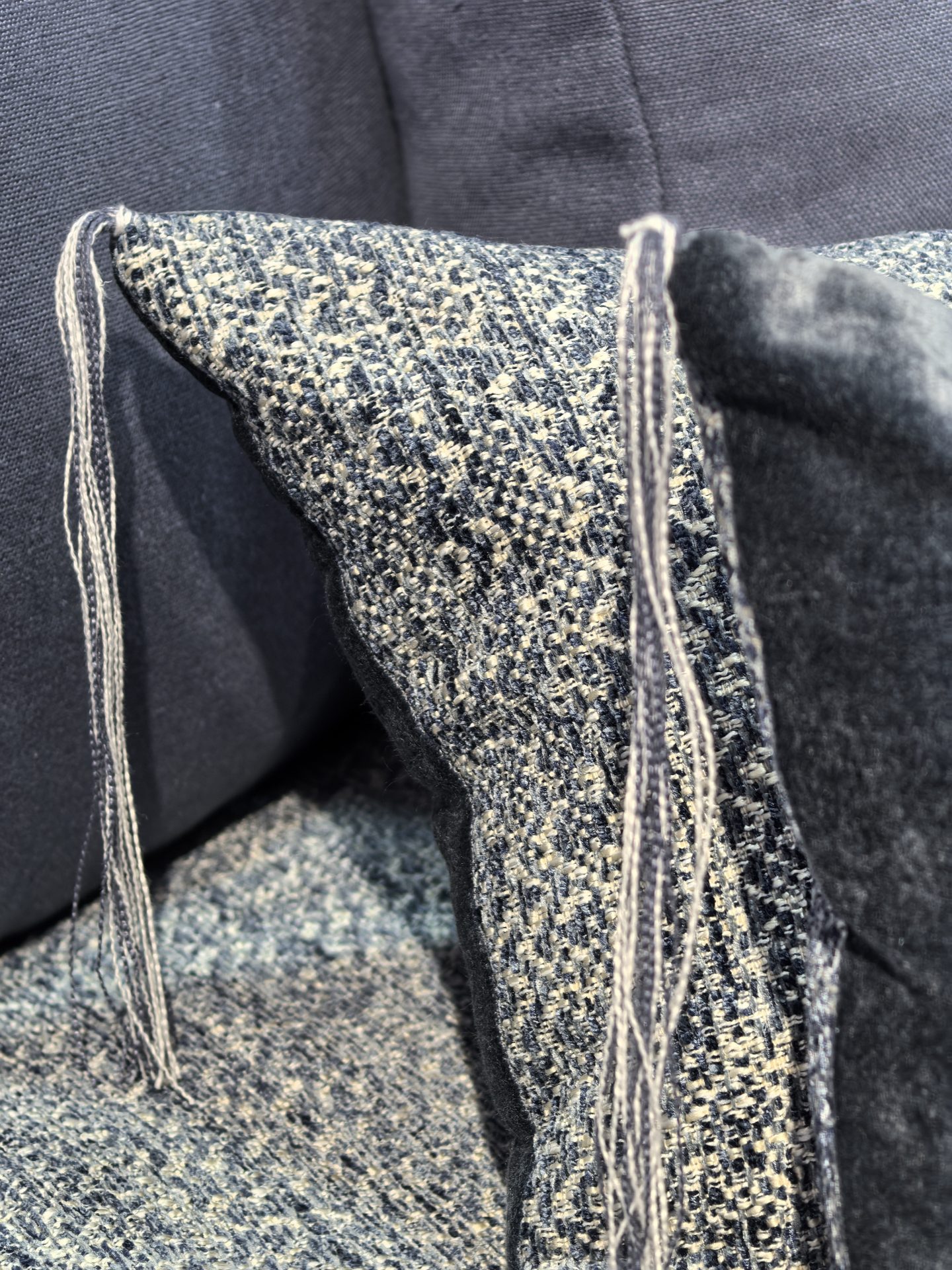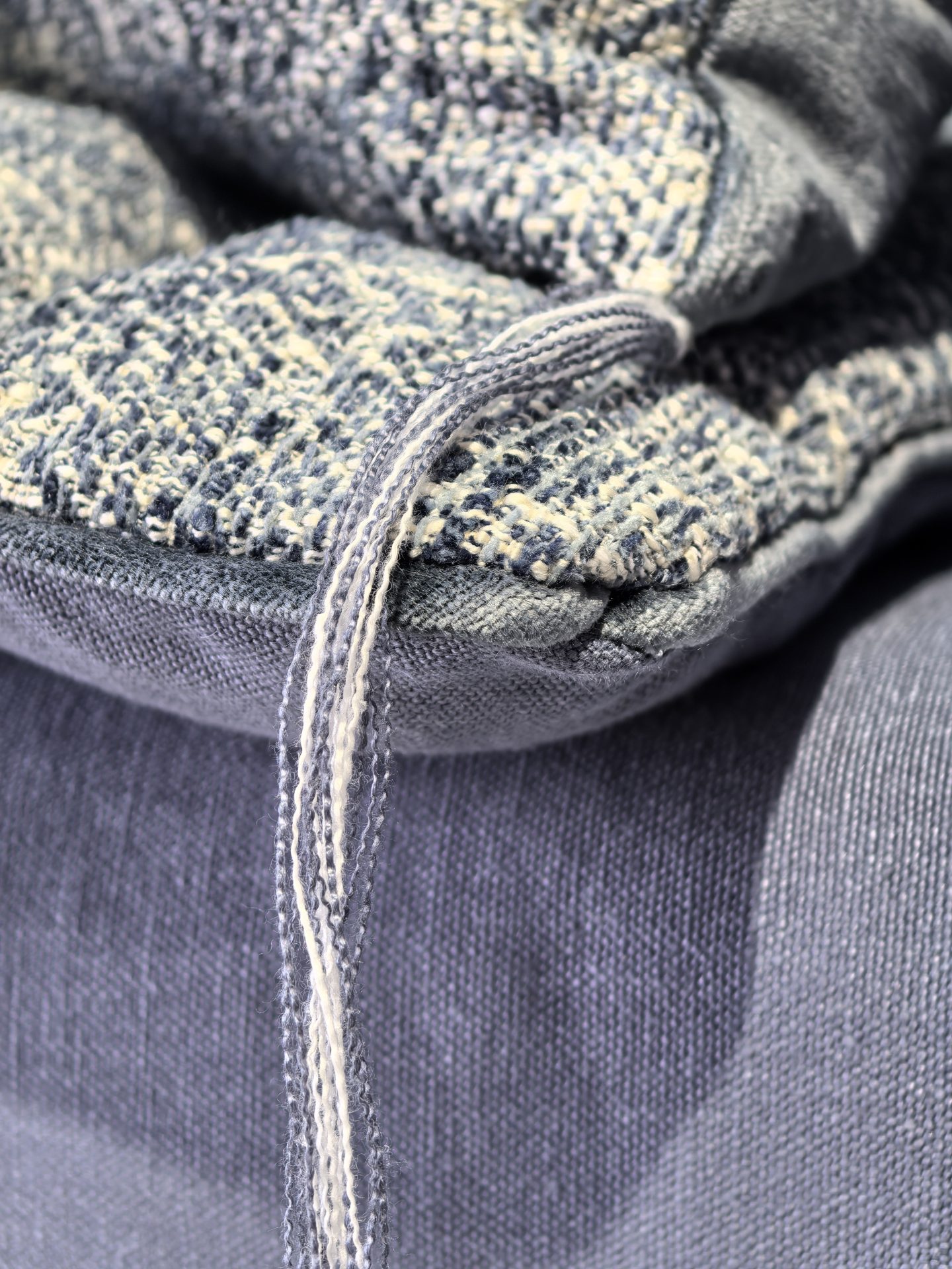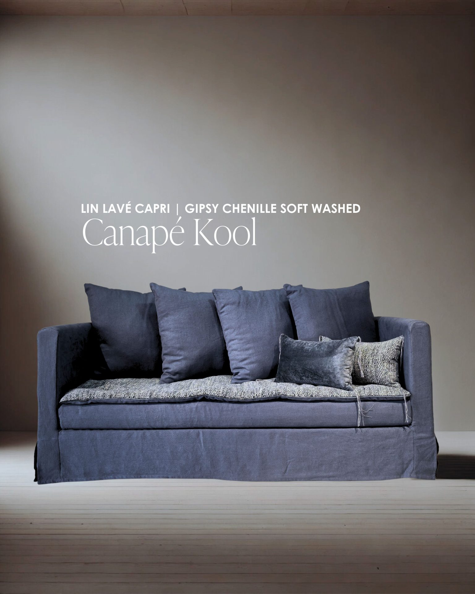 Ce canapé Kool est habillé du Gipsy chenille soft washed indigo et du lin lavé Capri dans une teinte devenue rare et précieuse, le bleu Abyss.