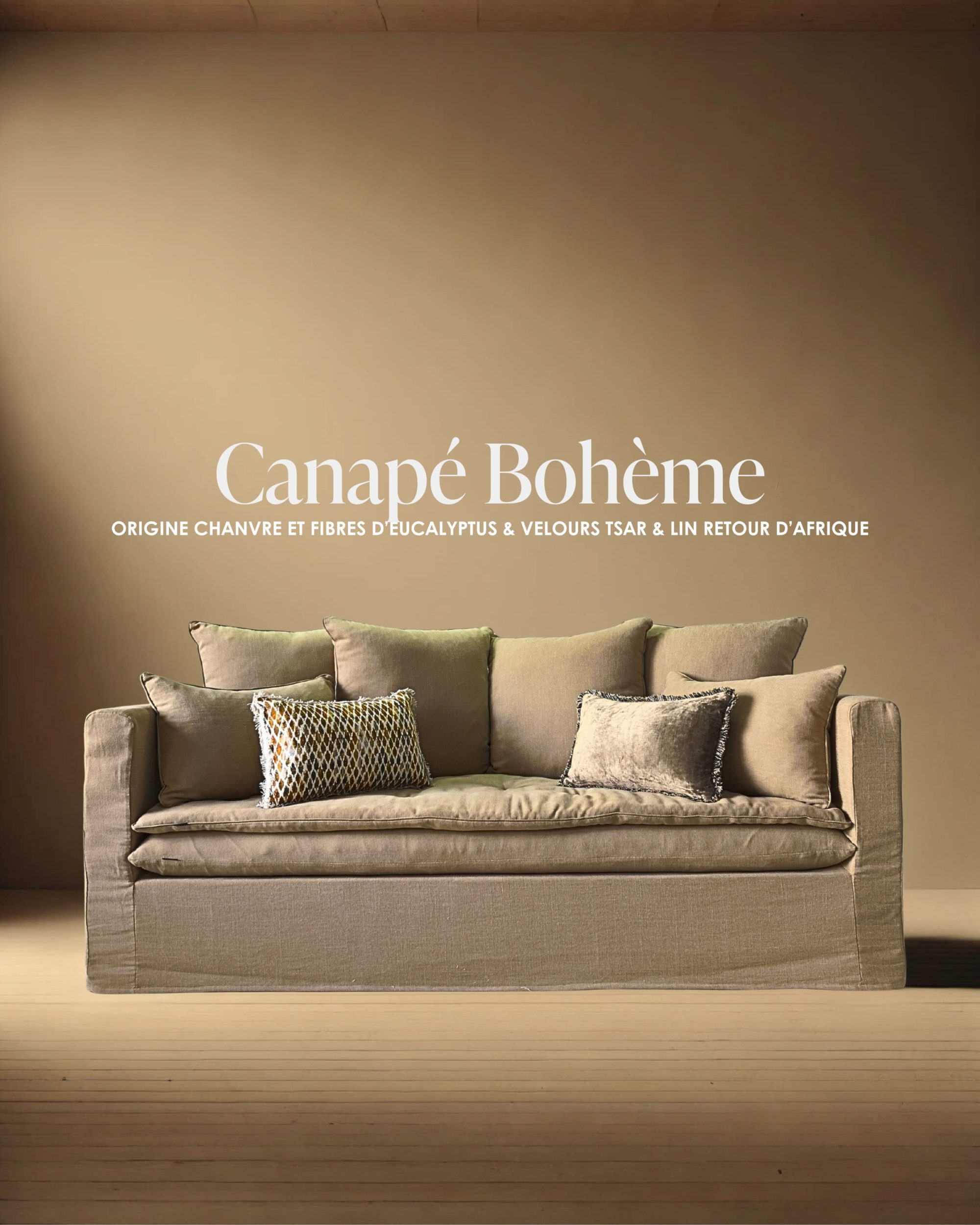 Canapé Bohème 200 cm en tissu Origine chanvre & fibres d’eucalyptus coloris havane beach