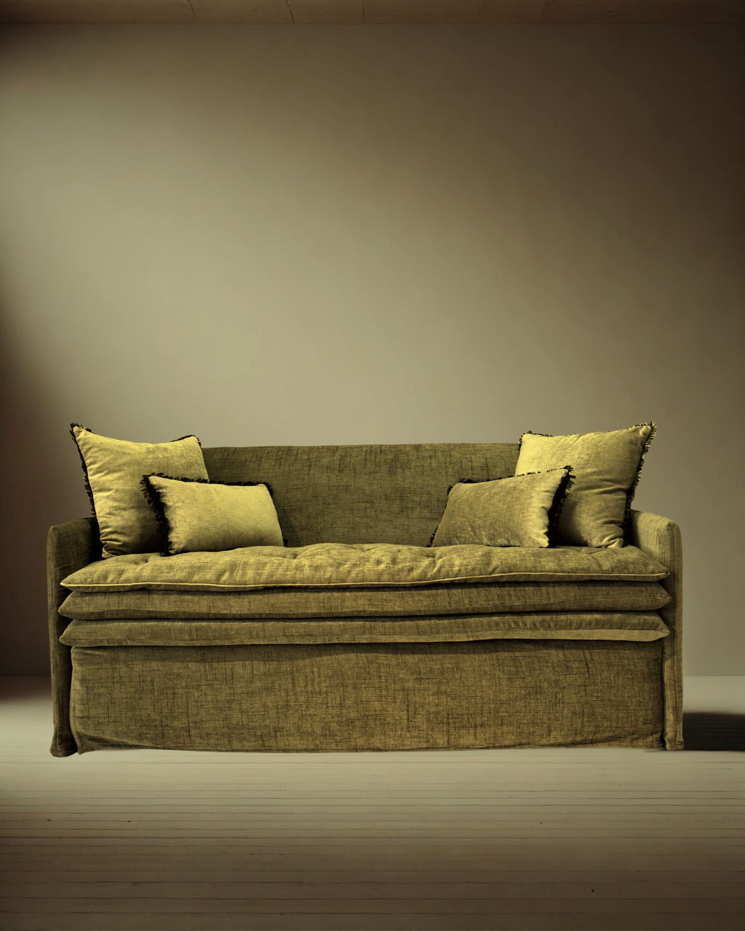 La ligne du canapé, fidèle à l’ADN de la Maison, est bohème, fluide, intemporelle, tandis qu’un éclat discret de velours Tsar et des finitions « frangées mains » Cheyenne apportent une petite touche de sophistication.