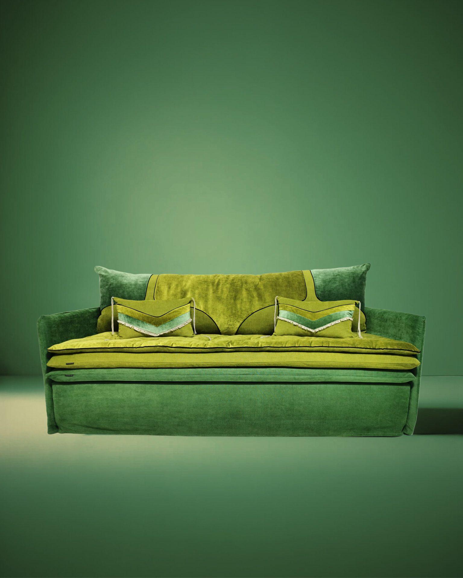 Rêve d’absinthe, la fée verte dialogue sous forme d’une chenille, dont la découpe courbée épouse le velours Tsar, souligné d’un subtil liseré velours noir.