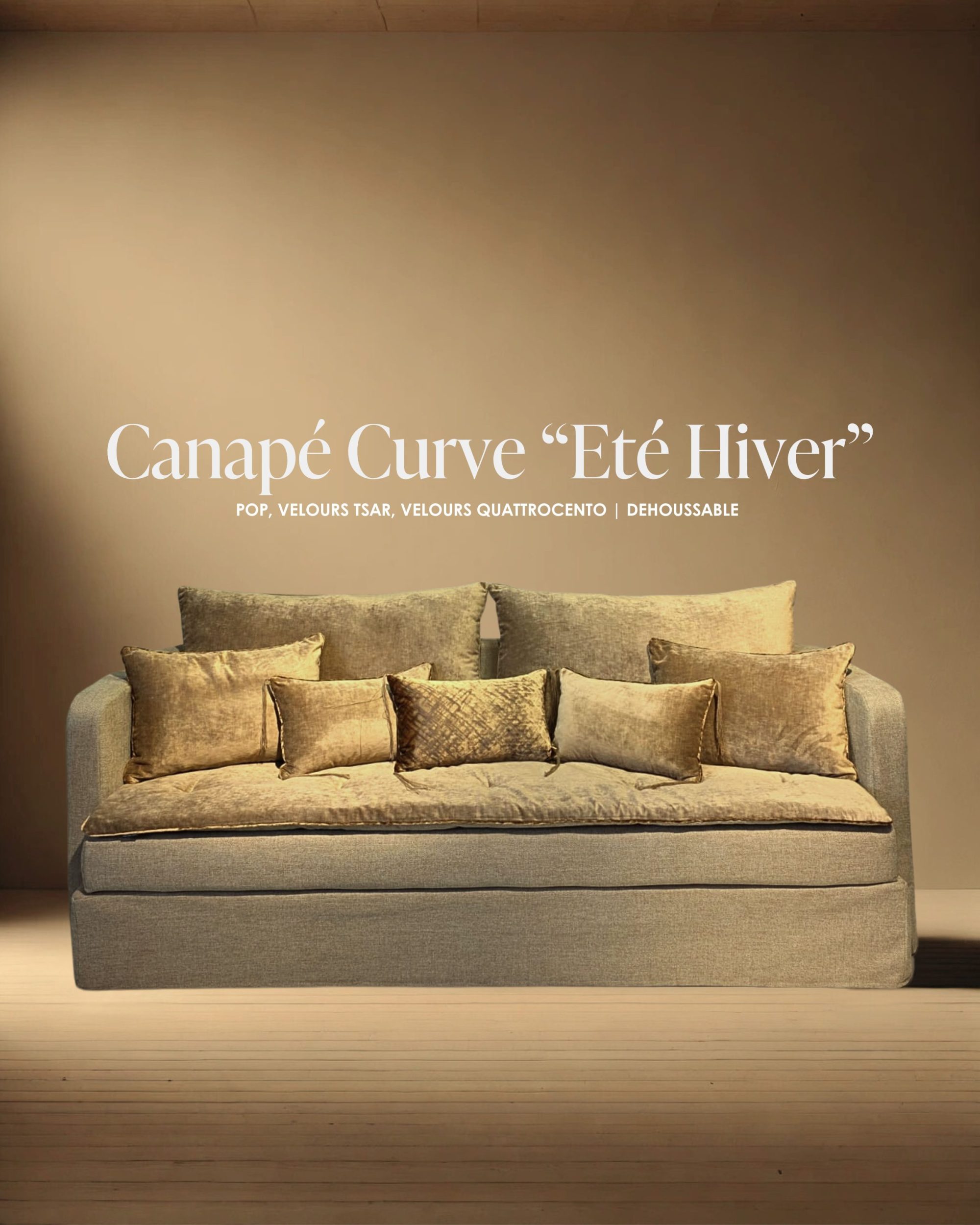 Avant son entrée en collection, ce canapé Curve est une pièce d’exploration textile, mettant en scène notre nouveau tissu POP dans son coloris Havane Beach, en harmonie chromatique avec le velours Tsar Havane Beach et le velours Quattrocento.