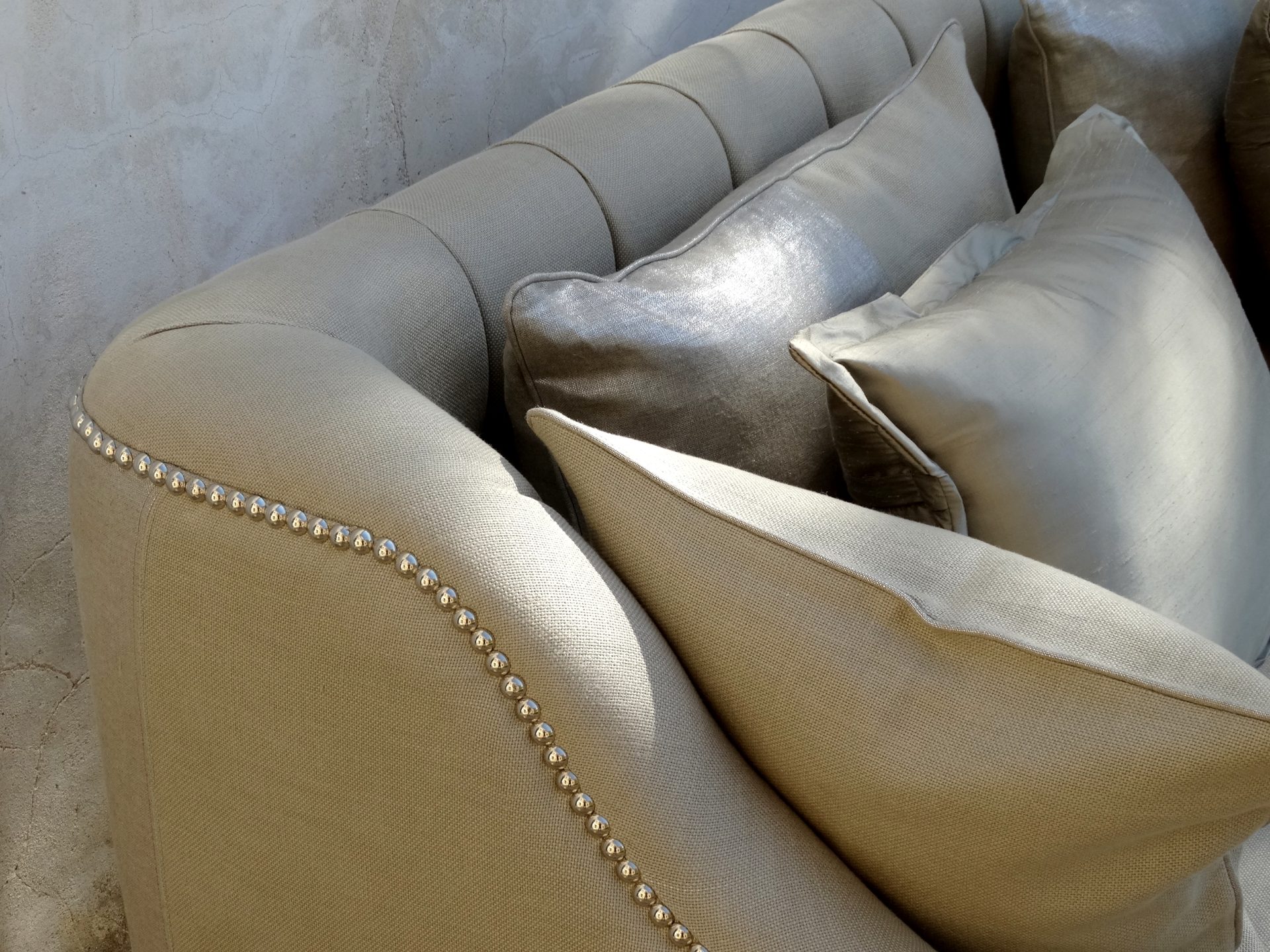 Son capiton délicatement dessiné sur son dossier, sa ligne enveloppante et l’éclat subtil de ses clous satinés composent un équilibre parfait entre sophistication et sérénité naturelle du lin.