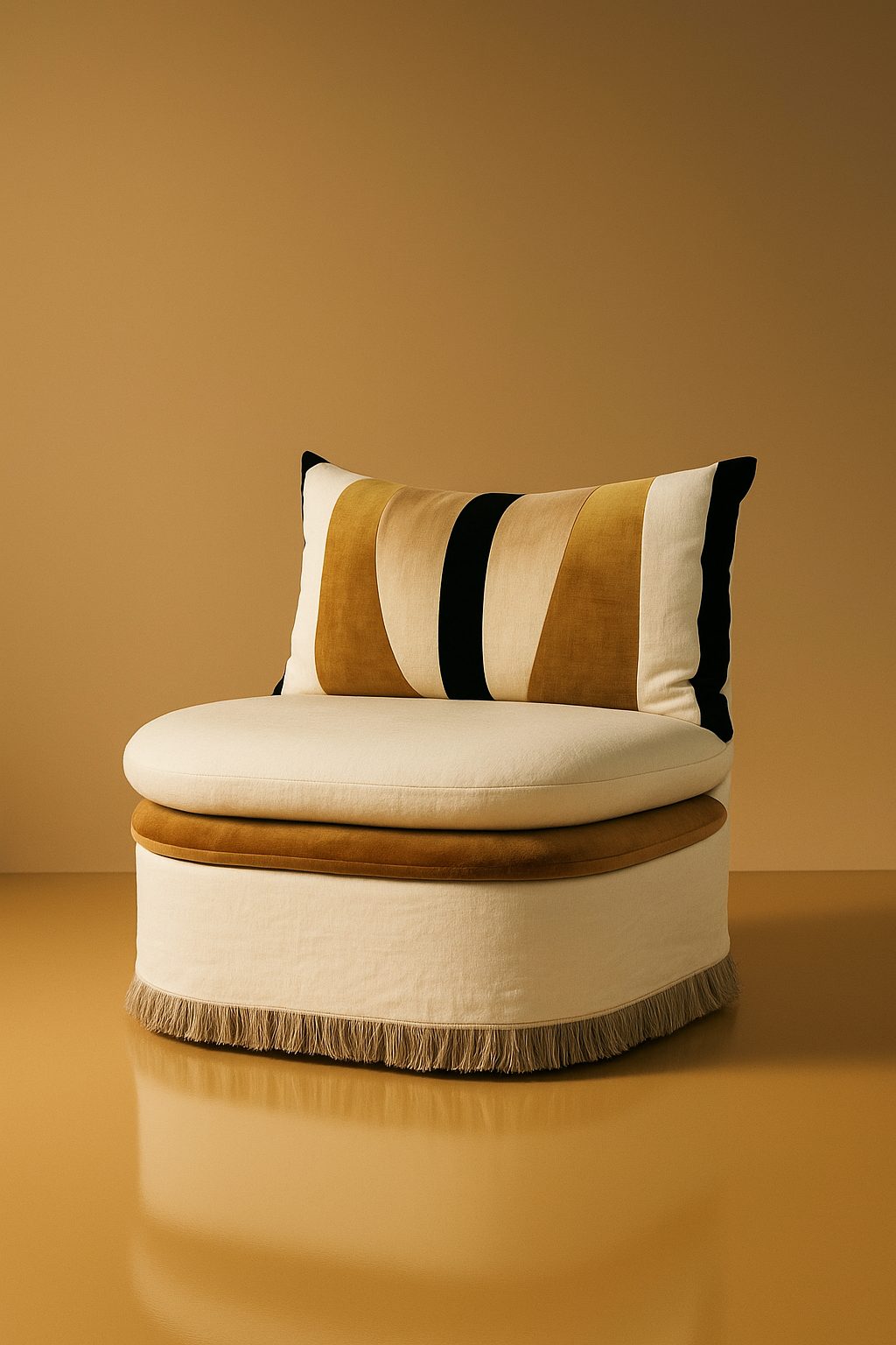 Le canapé Easy invite au lâcher-prise et créée un refuge où le design se fait poésie, invitant la chaleur d’un été perpétuel, tandis que ses précieux empiècements de velours Tsar cousus main, craie, havane beach, noir, captent la lumière.