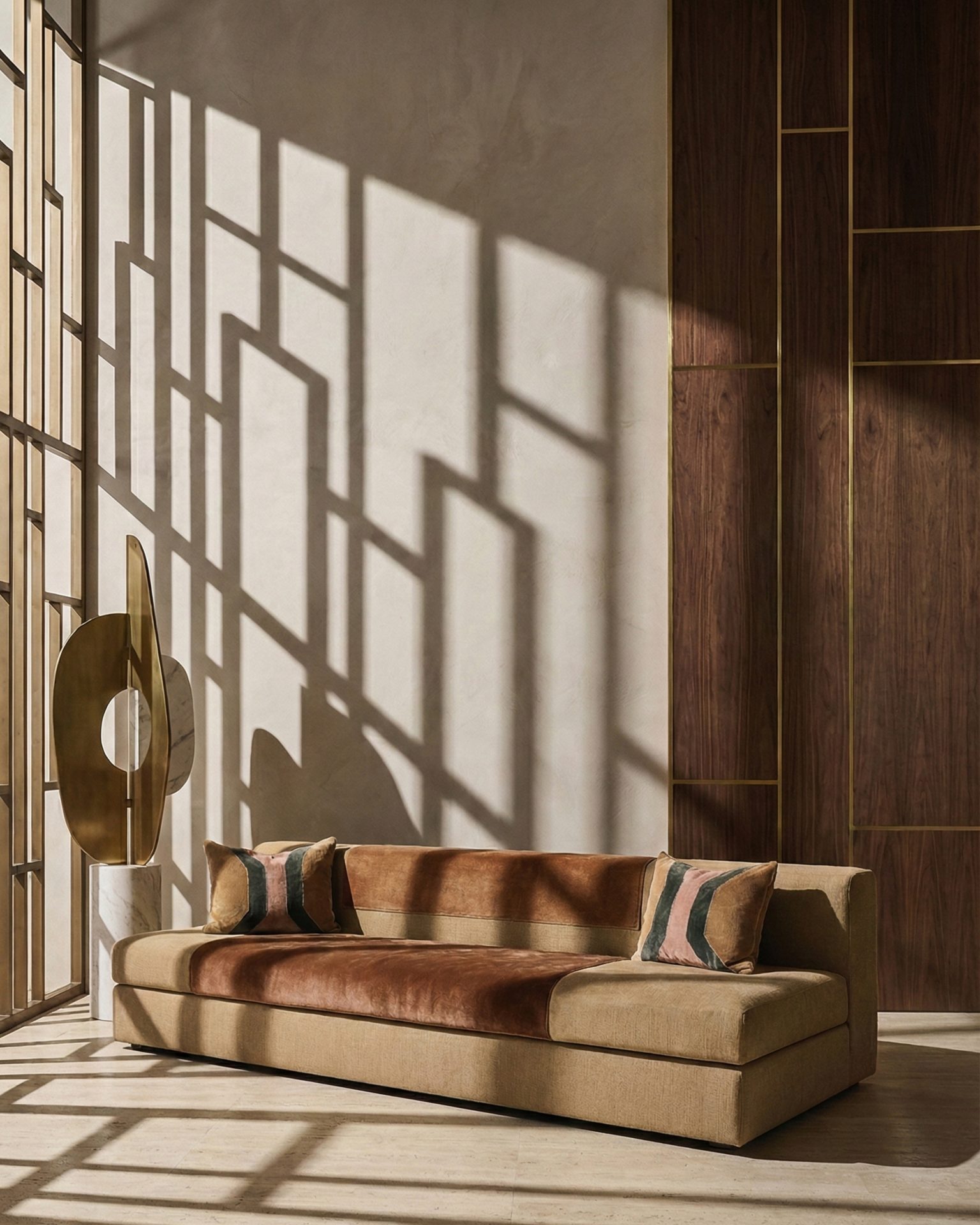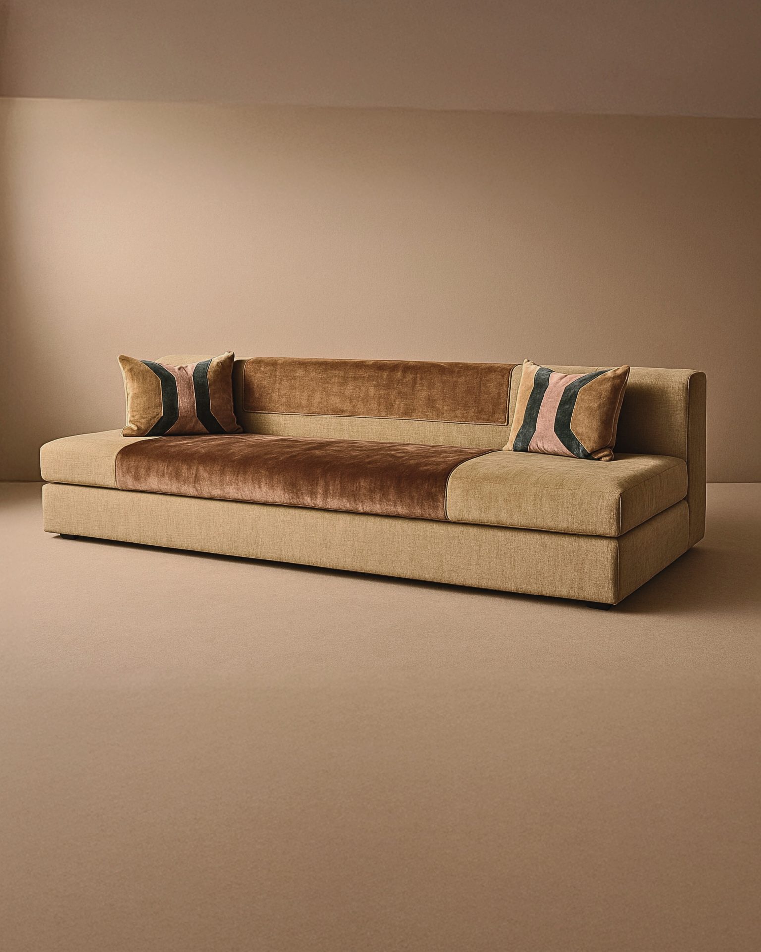 Ses empiècements de velours Tsar, cousus main, sculptent la lumière et révèlent une matière vibrante tandis que la géométrie rencontre la douceur pour créer un refuge sensoriel, couture et chaleureux.