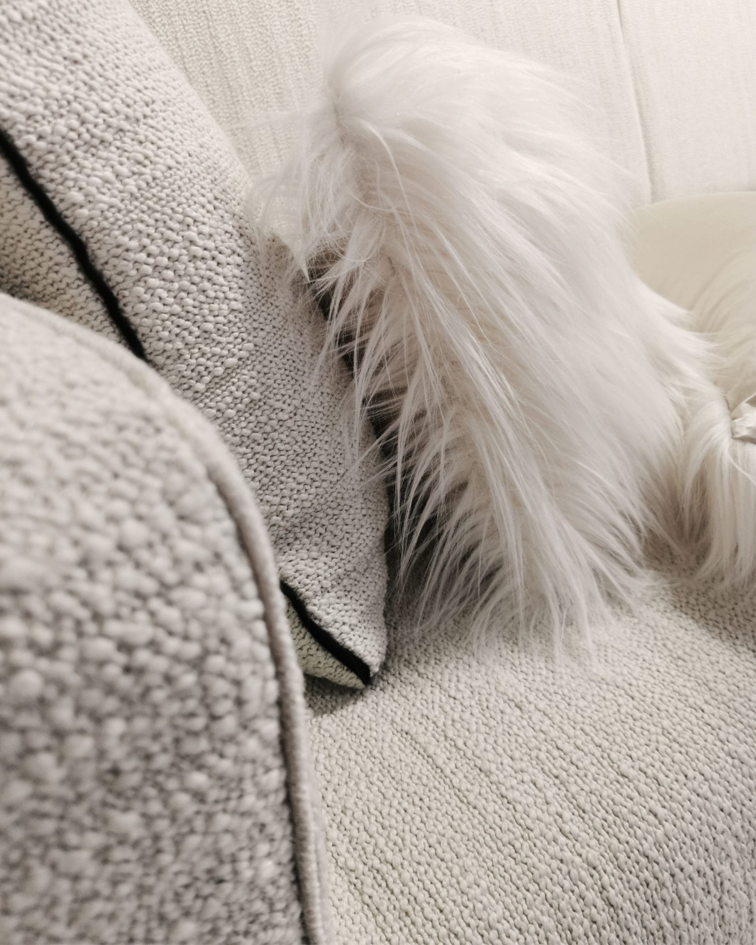 1 coussin 30 x 50 cm recto fausse fourrure Iba craie ( côté hiver ) verso satin de lin Possession ( côté été )