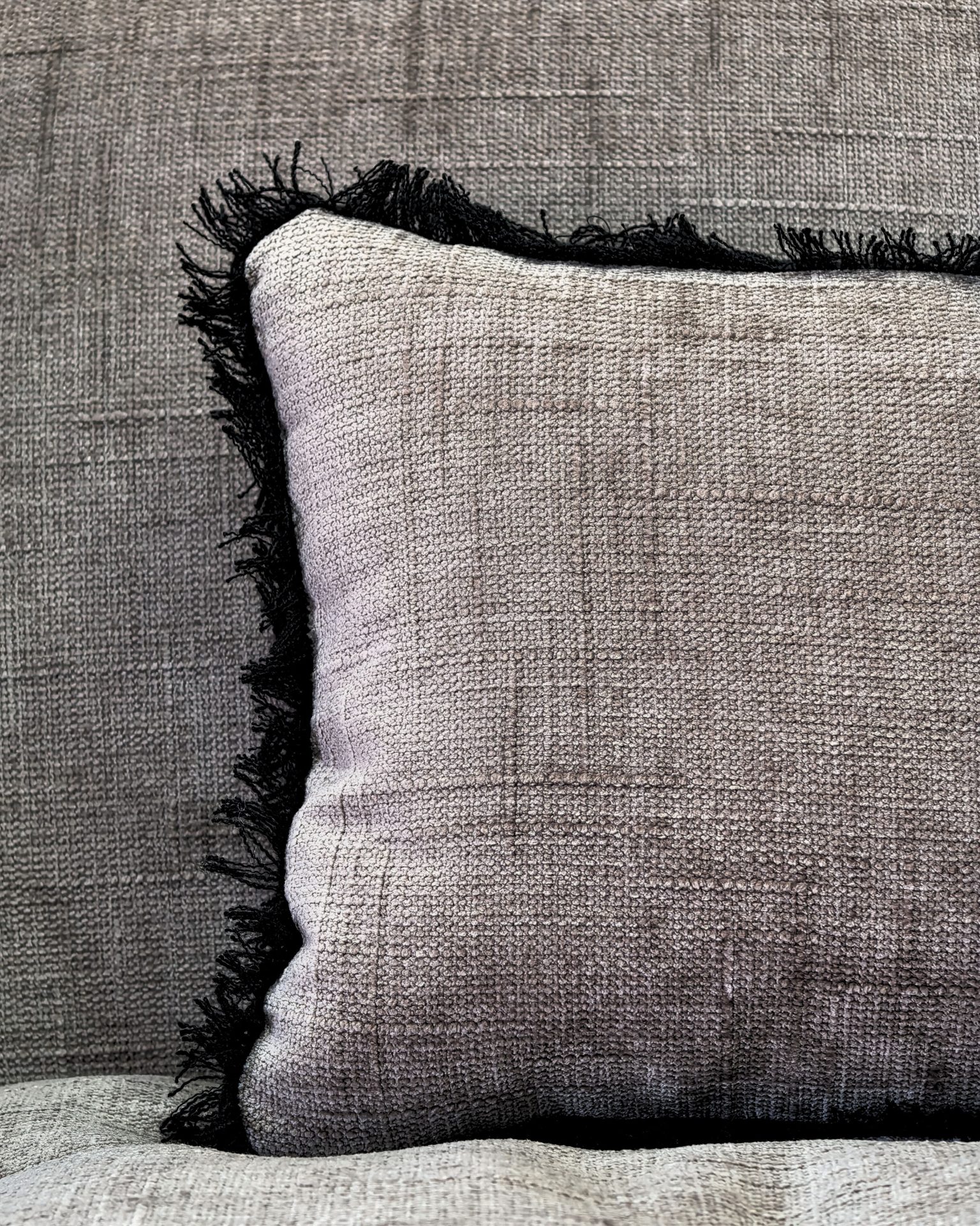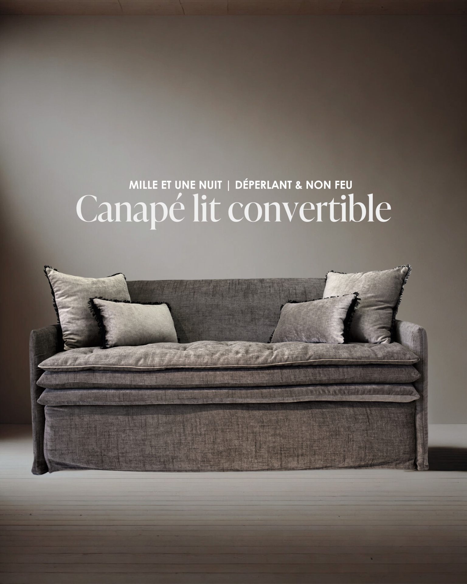 Ce canapé convertible a été conçu comme un terrain d’exploration textile, une pièce unique mettant en scène le nouveau tissu Tribu dans le coloris écorce que nous explorons pour la première fois et qui se marie à merveille avec le velours Tsar ciment.