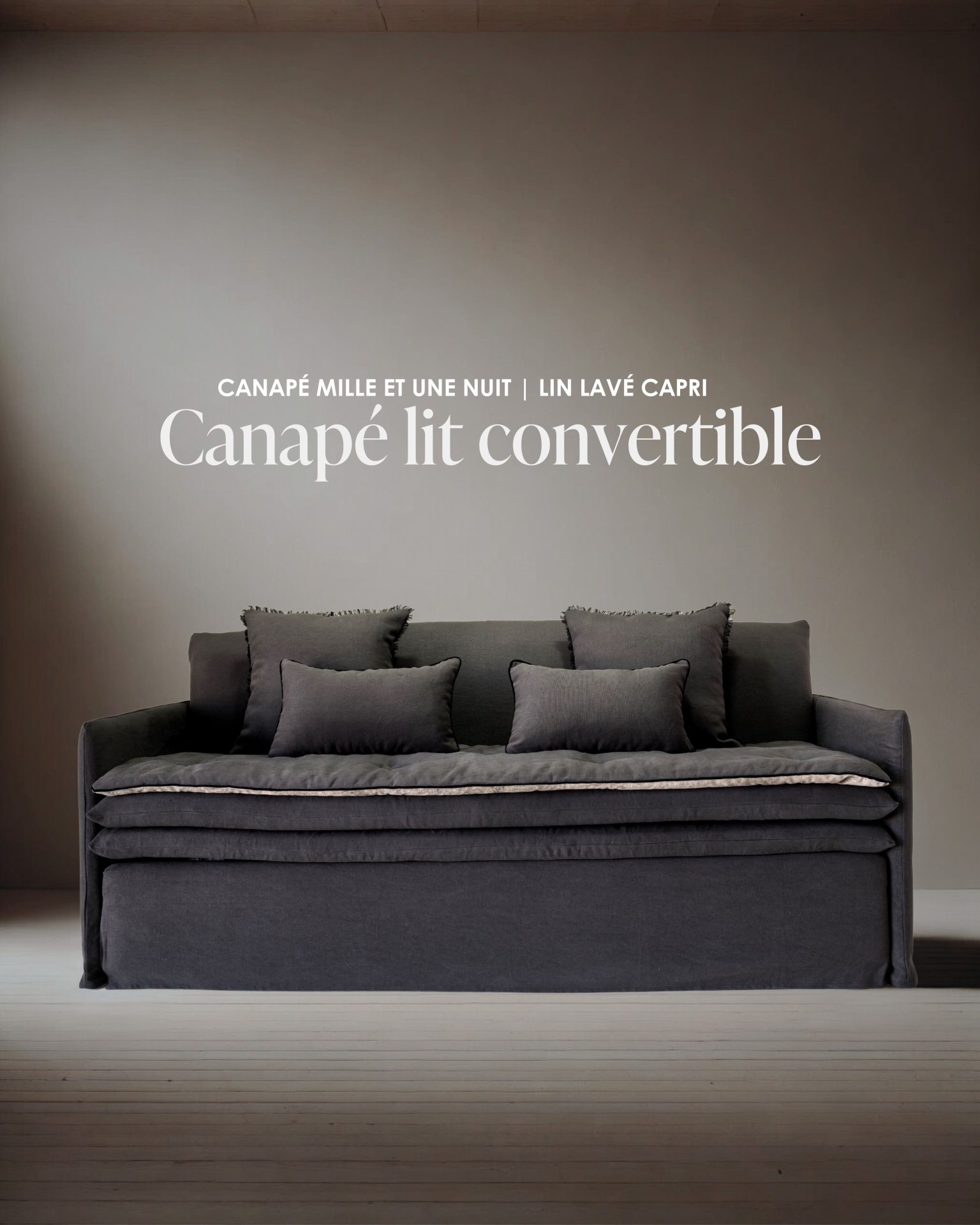 Accueil / Offres Privilèges / Canapé lit convertible Mille Et Une Nuit 180 cm en lin lavé Capri gris éléphant & velours Tsar éléphant / Fabriqué en France
