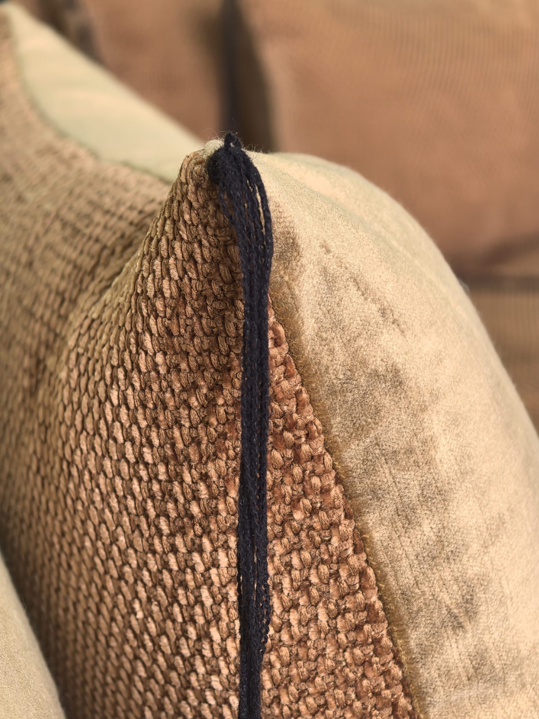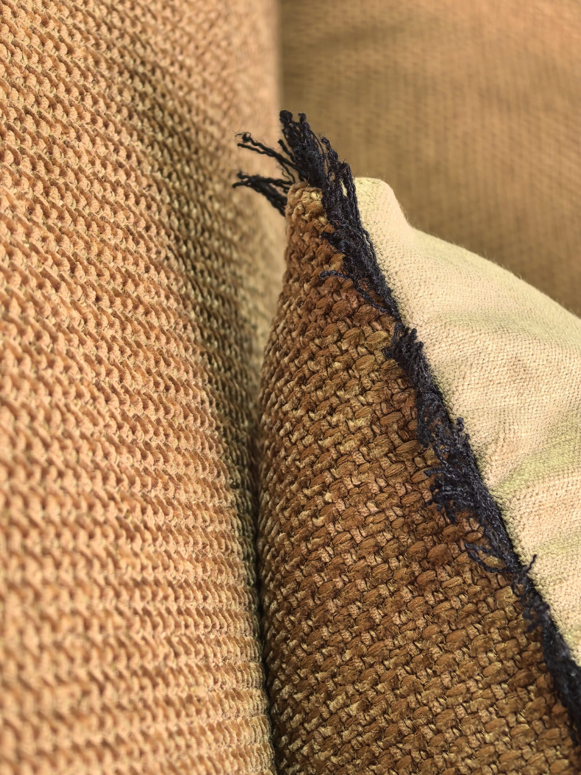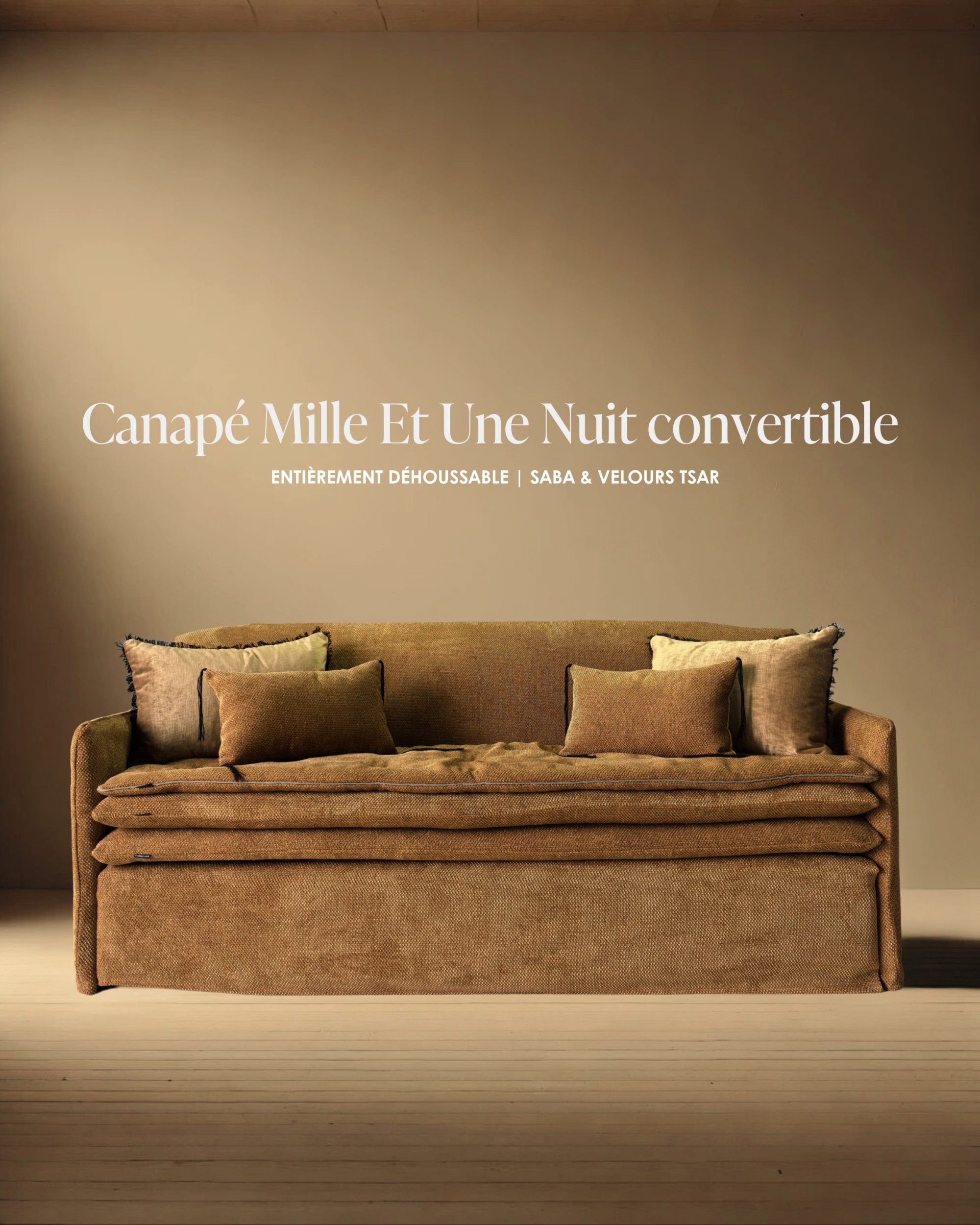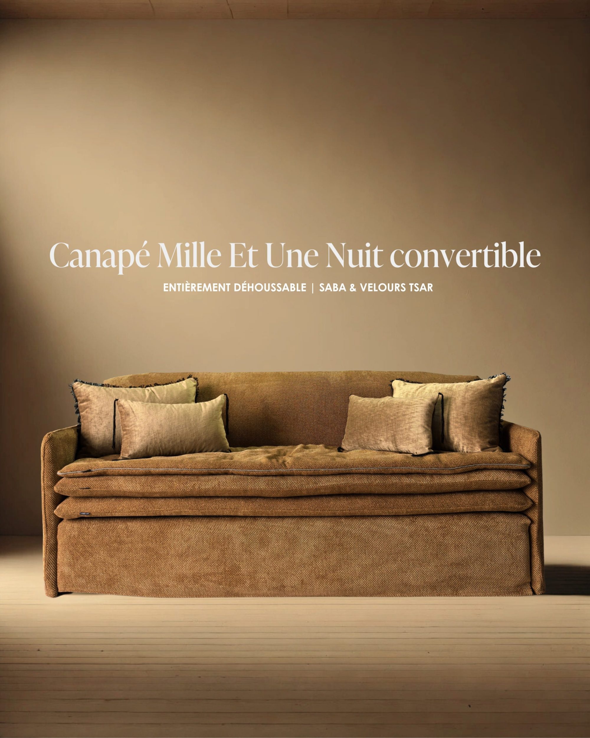 Avant d’entrer en collection, ce canapé a été conçu comme la première pièce d’exploration textile, pensée pour sublimer notre nouveau tissu Saba dans un accord chromatique raffiné avec le velours Tsar Havane Beach .