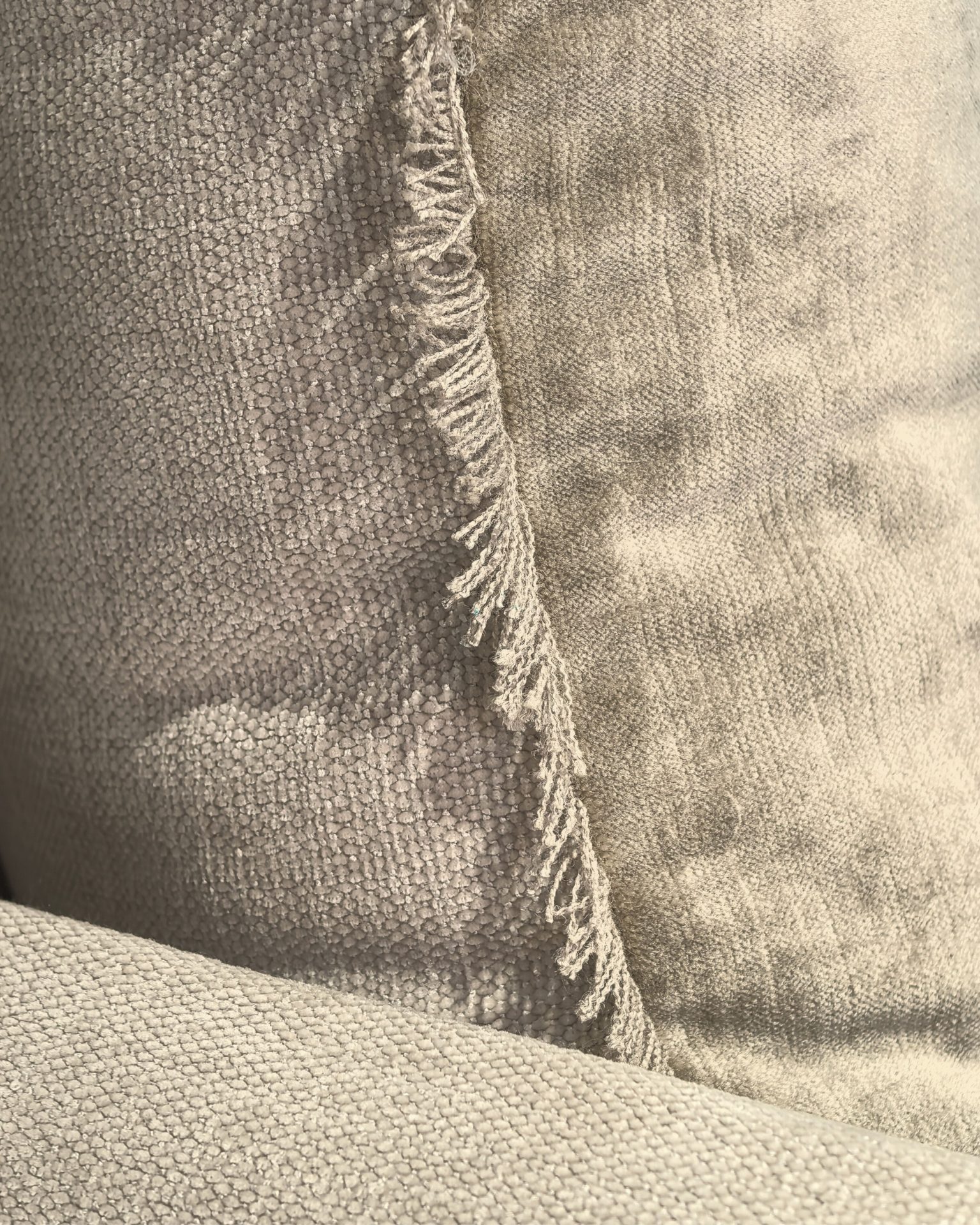 2 coussins 50 x 50 cm recto Totem ciment verso velours Tsar ciment finition "frangés mains" Cheyenne ciment