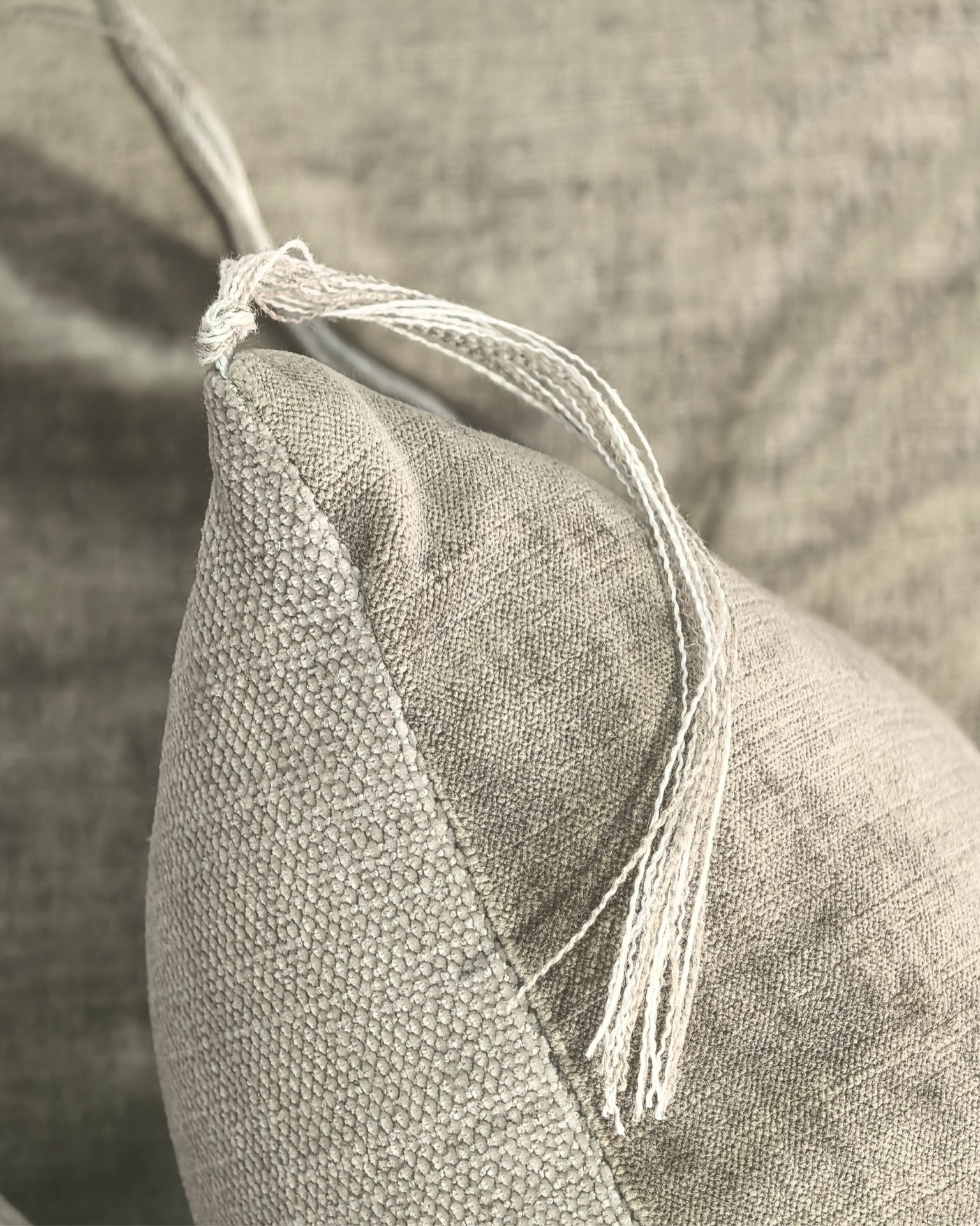 2 coussins 30 x 50 cm recto Totem ciment verso velours Tsar ciment finition fils nœuds lin ciment et lin craie