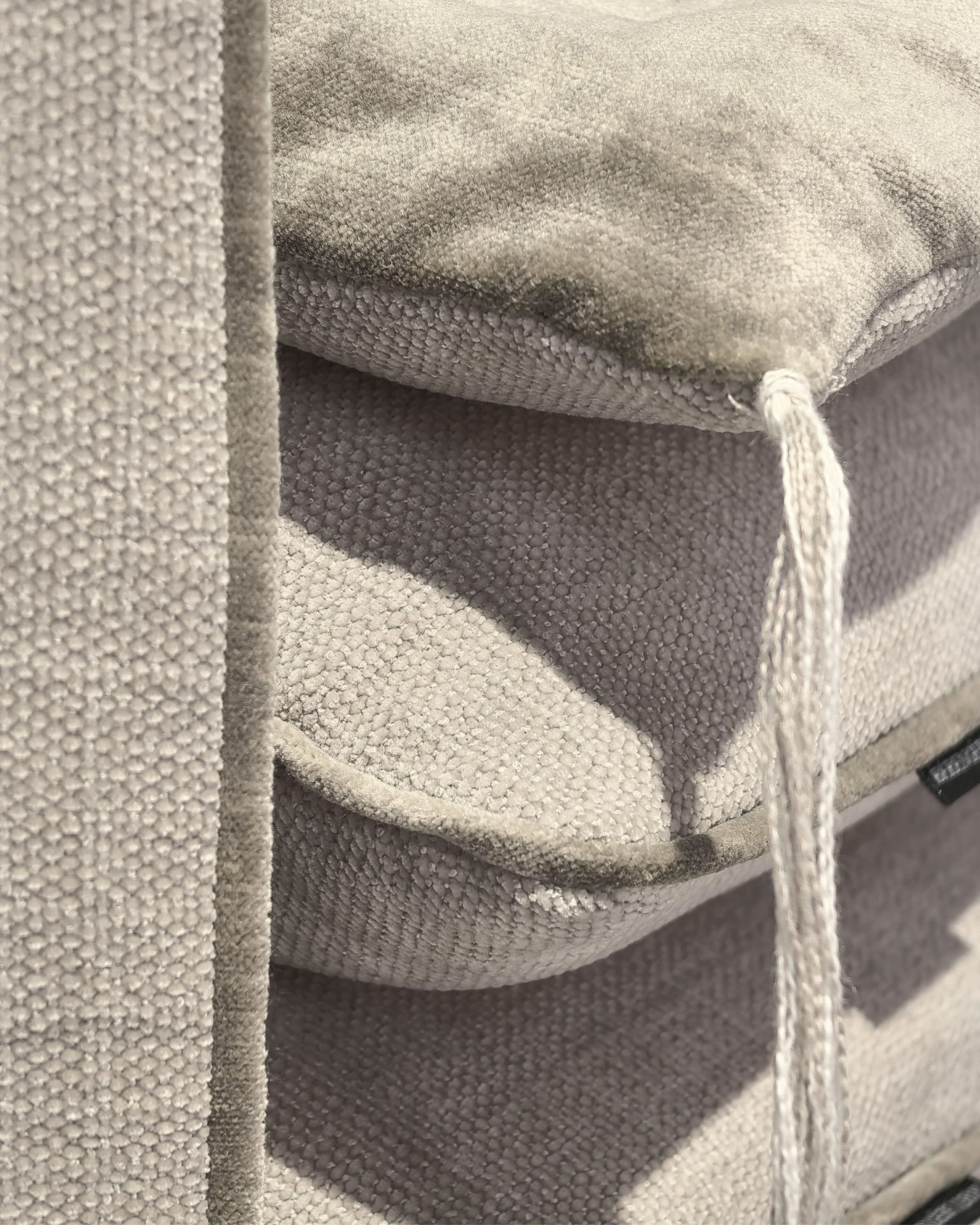 Sofa Cover sur mesure Totem ciment verso velours Tsar ciment finition fils nœuds ciment et craie