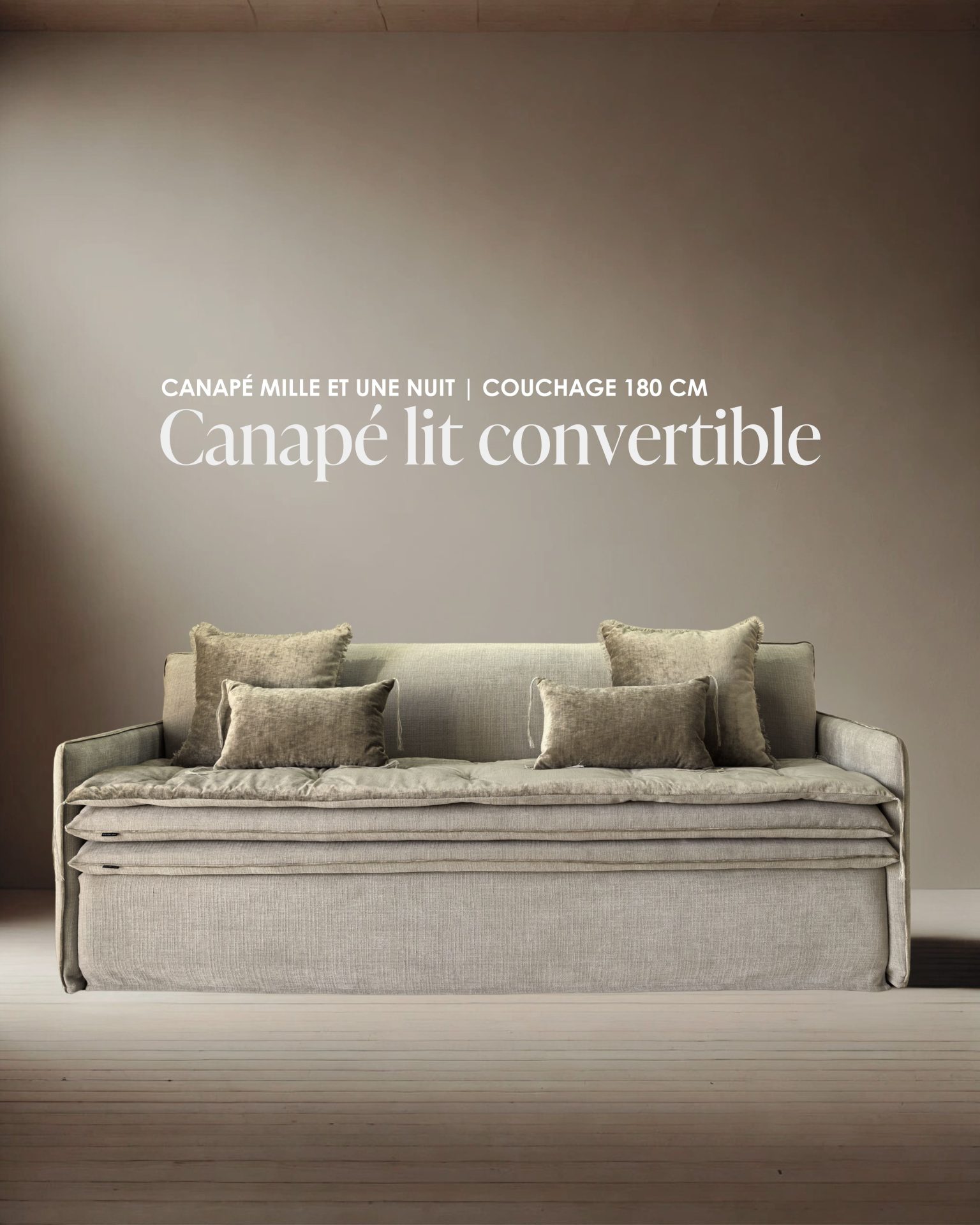 Le canapé convertible Mille Et Une Nuit est habillé par notre tissu Totem, notre nouveau tissu chiné, avant son entrée en collection. Une subtile harmonie chromatique, un très beau jeu de matières avec notre velours Tsar sable.