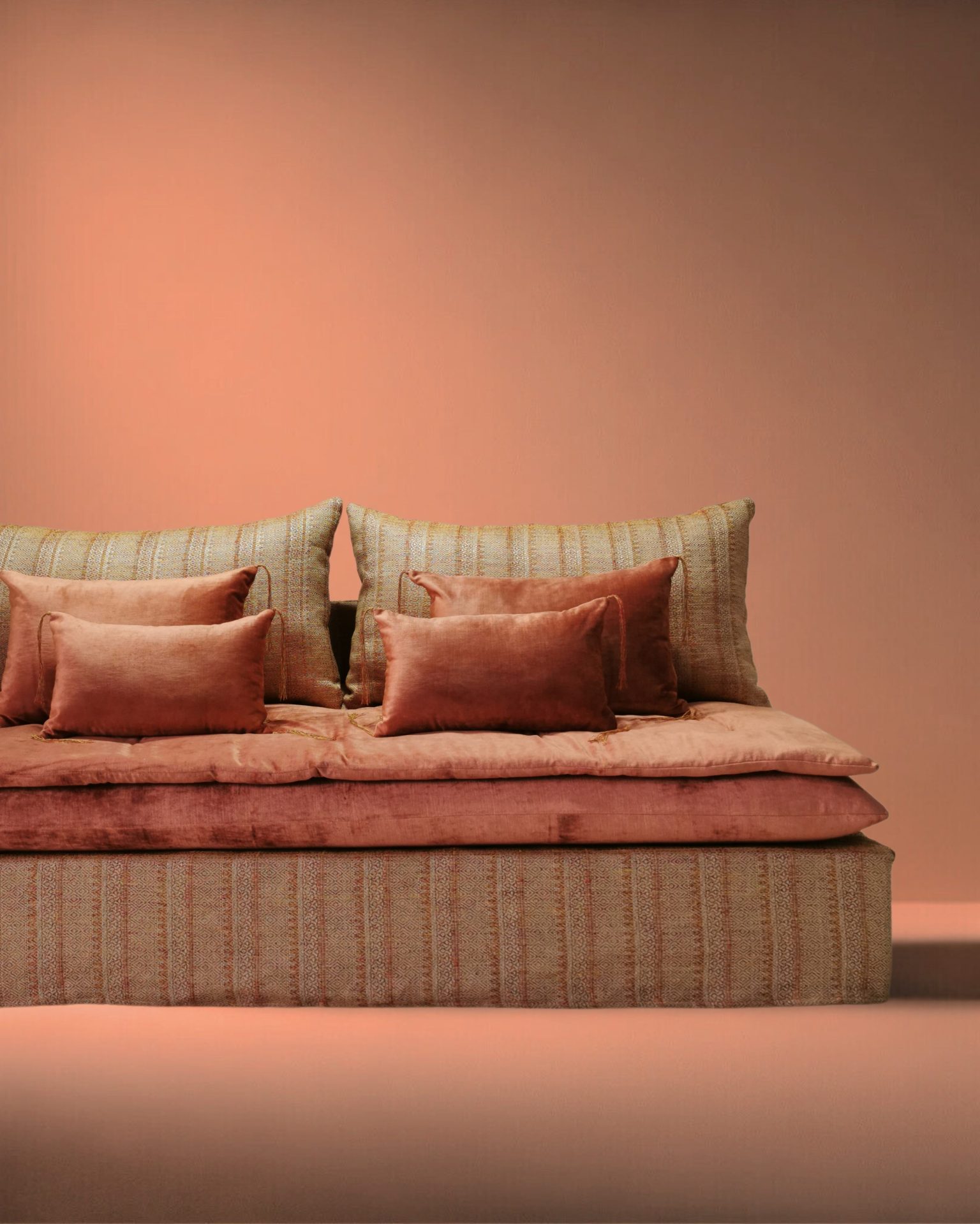 Alliant sophistication bohème et élégance glamour, le canapé Mille Et Une Nuit est habillé du lin Medina Rouge Héritage, une signature intemporelle.