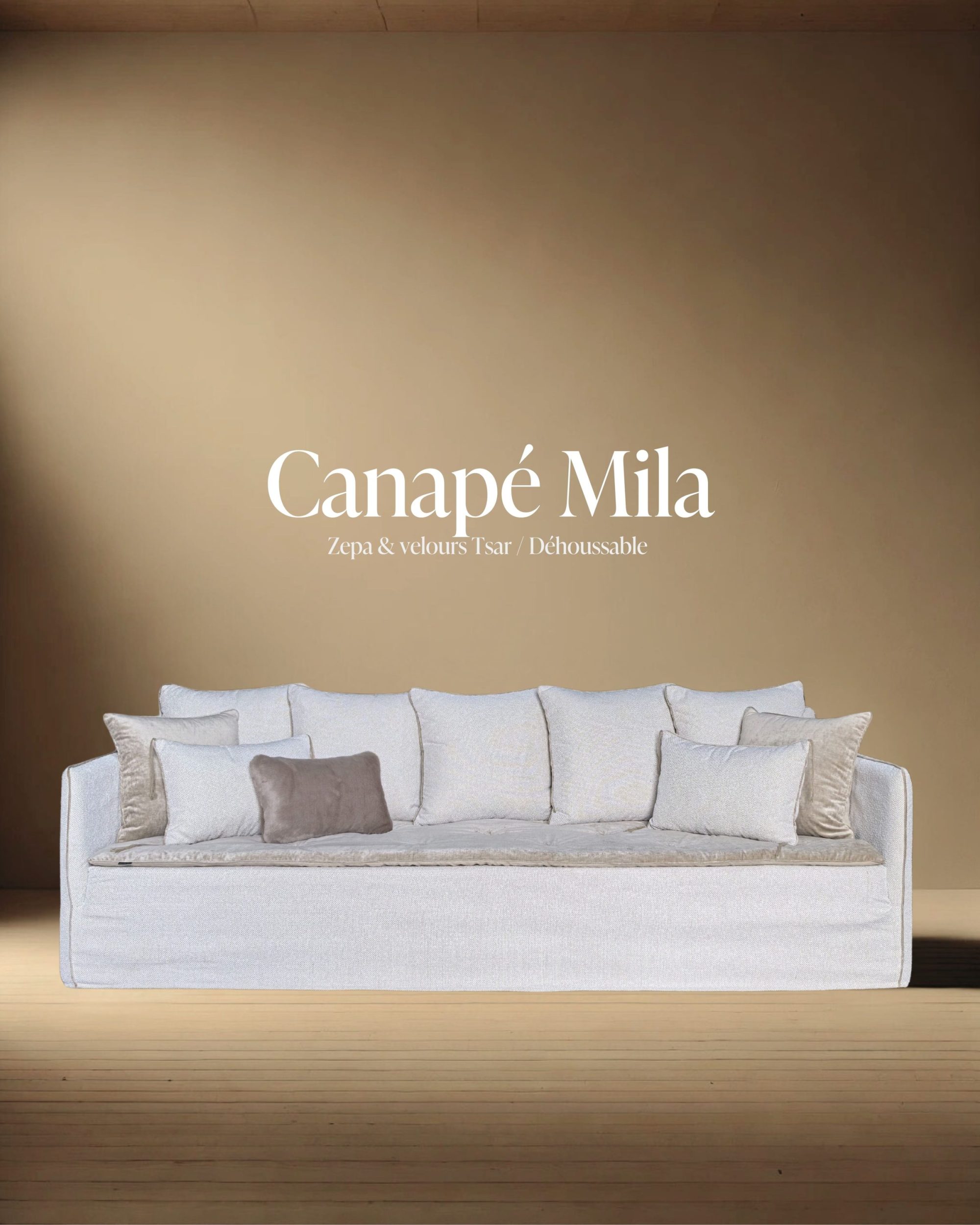Accueil / Offres Privilèges / Canapé Mila 260 cm en Zepa & velours Tsar sable