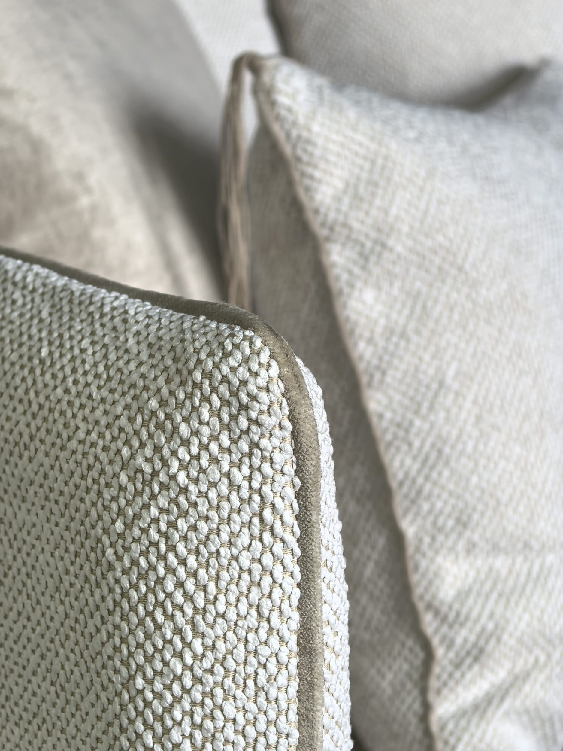 2 coussins 50 x 50 cm recto velours Tsar sable verso lin Vérone sable finition liseret velours Tsar sable