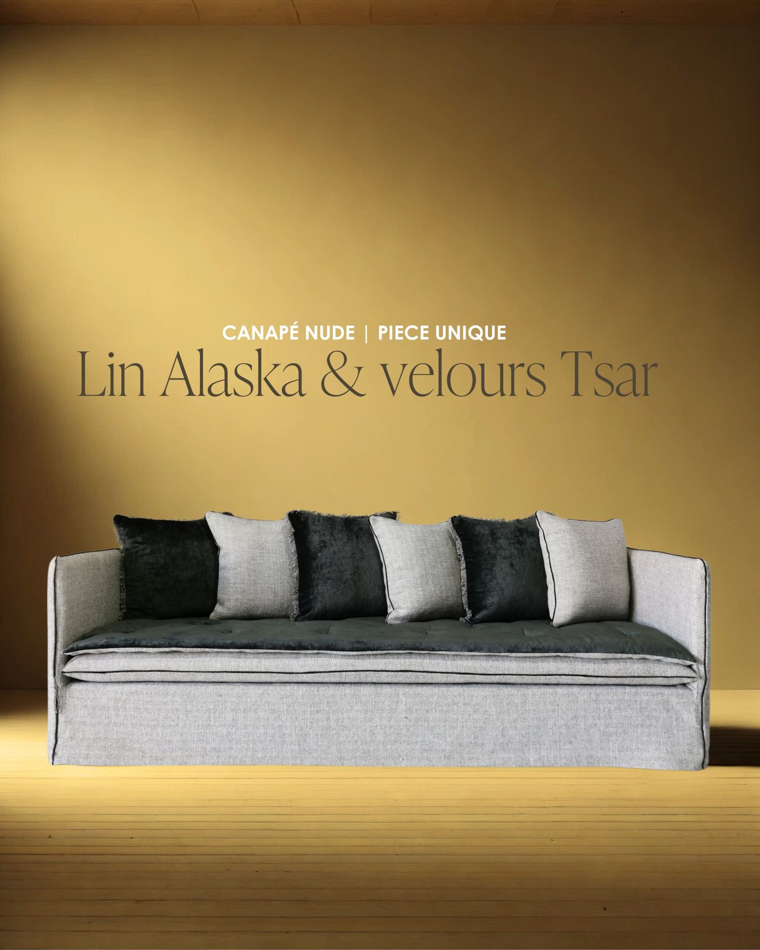 Sofa Cover recto lin Alaska verso velours Tsar carbone finition fils nœuds lin Alaska et points couture