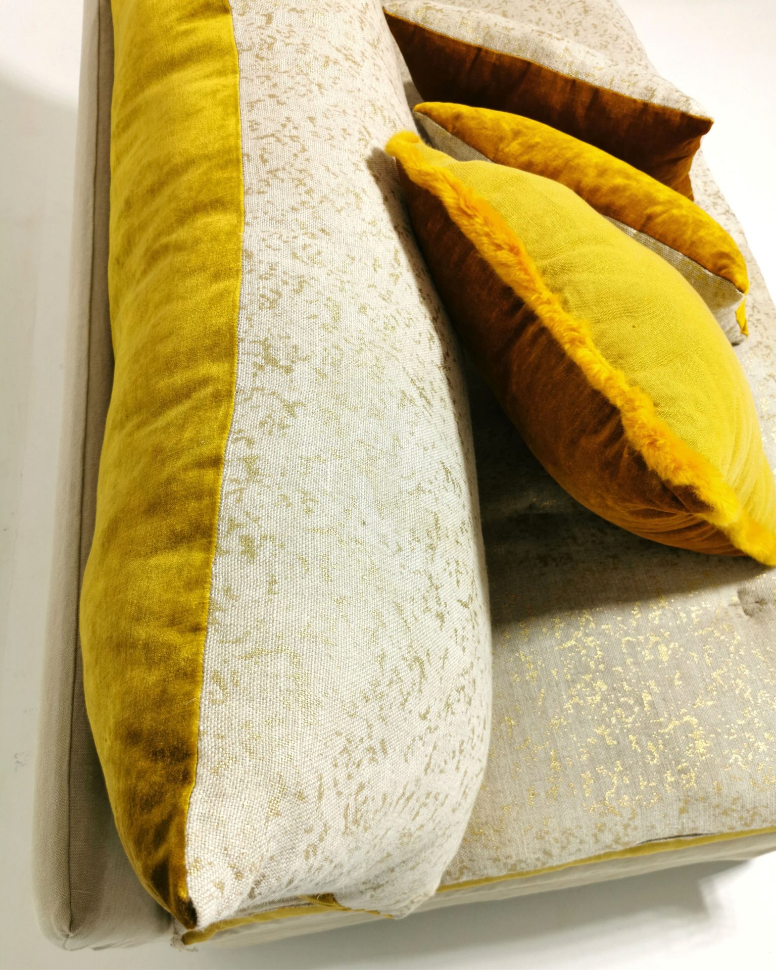 Grand coussin de dossier recto lin Miss bohème doré verso velours Tsar curry finition bord à bord
