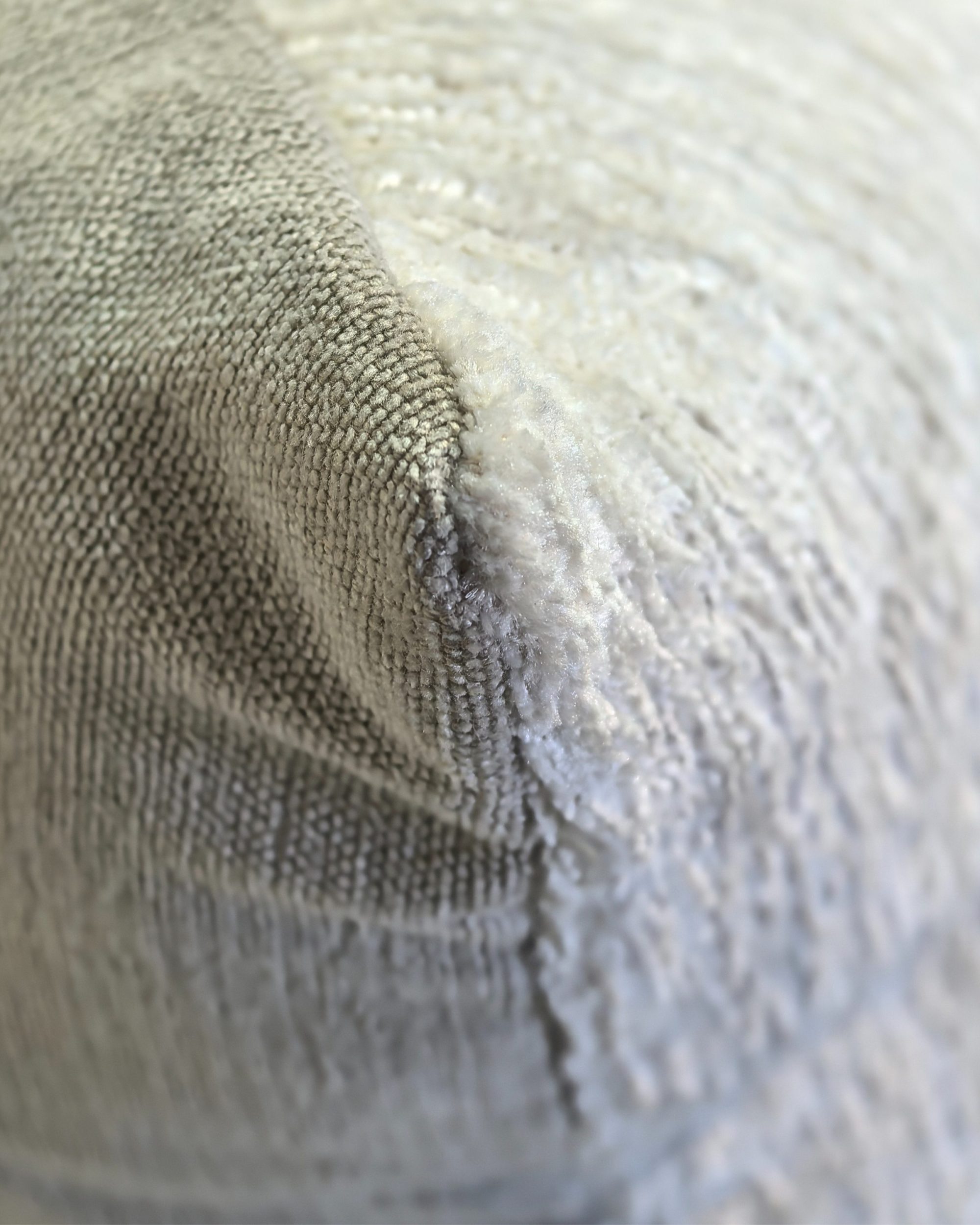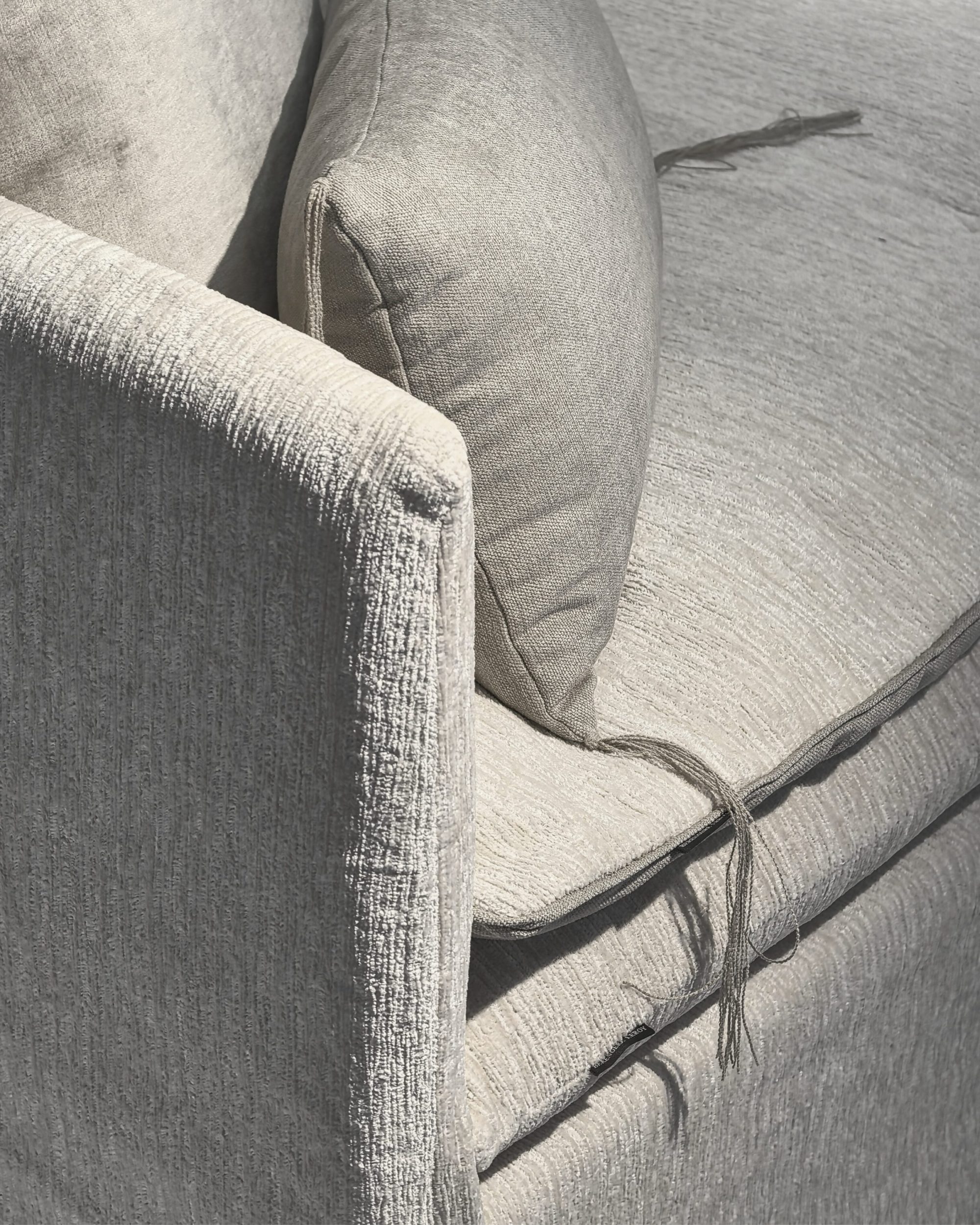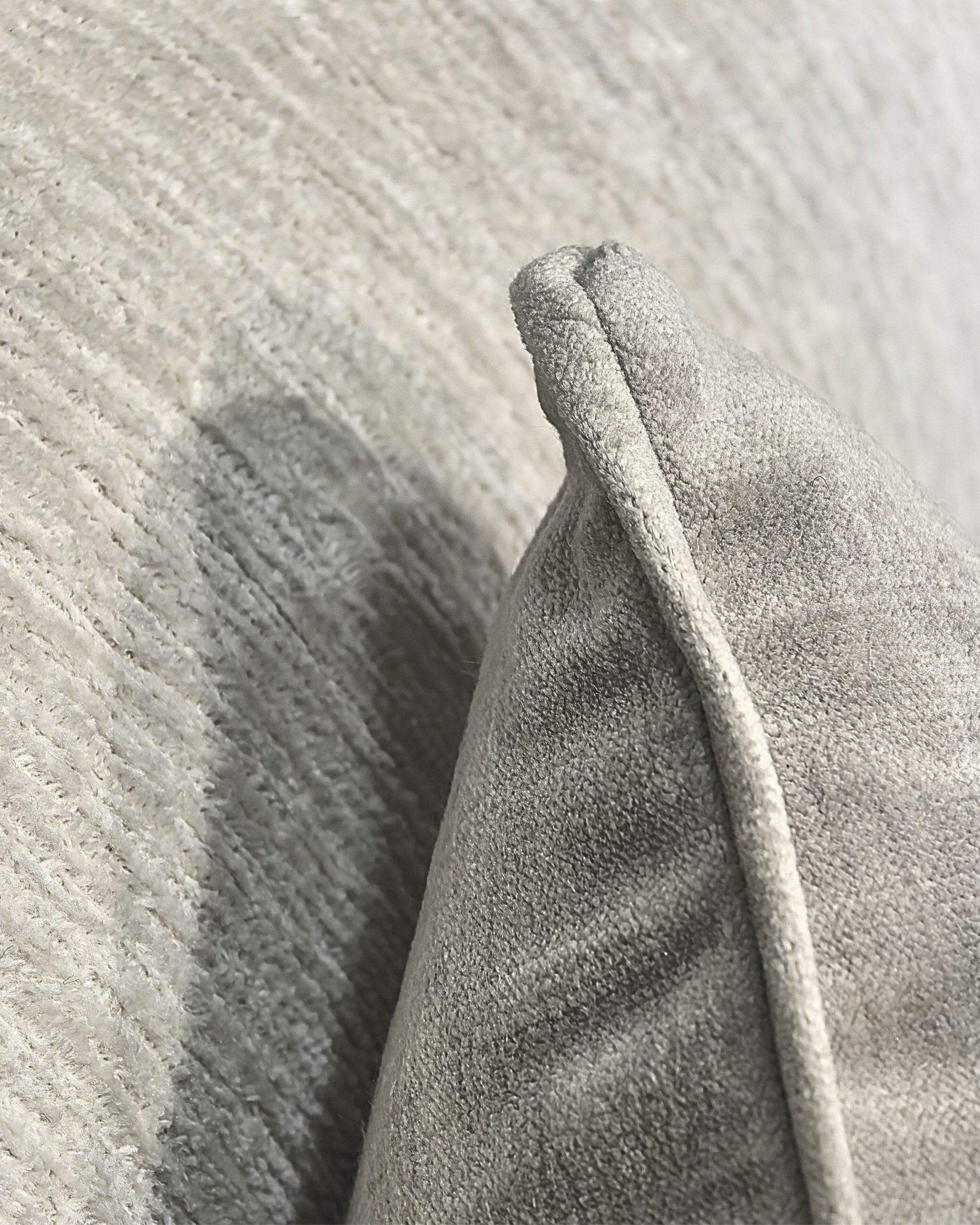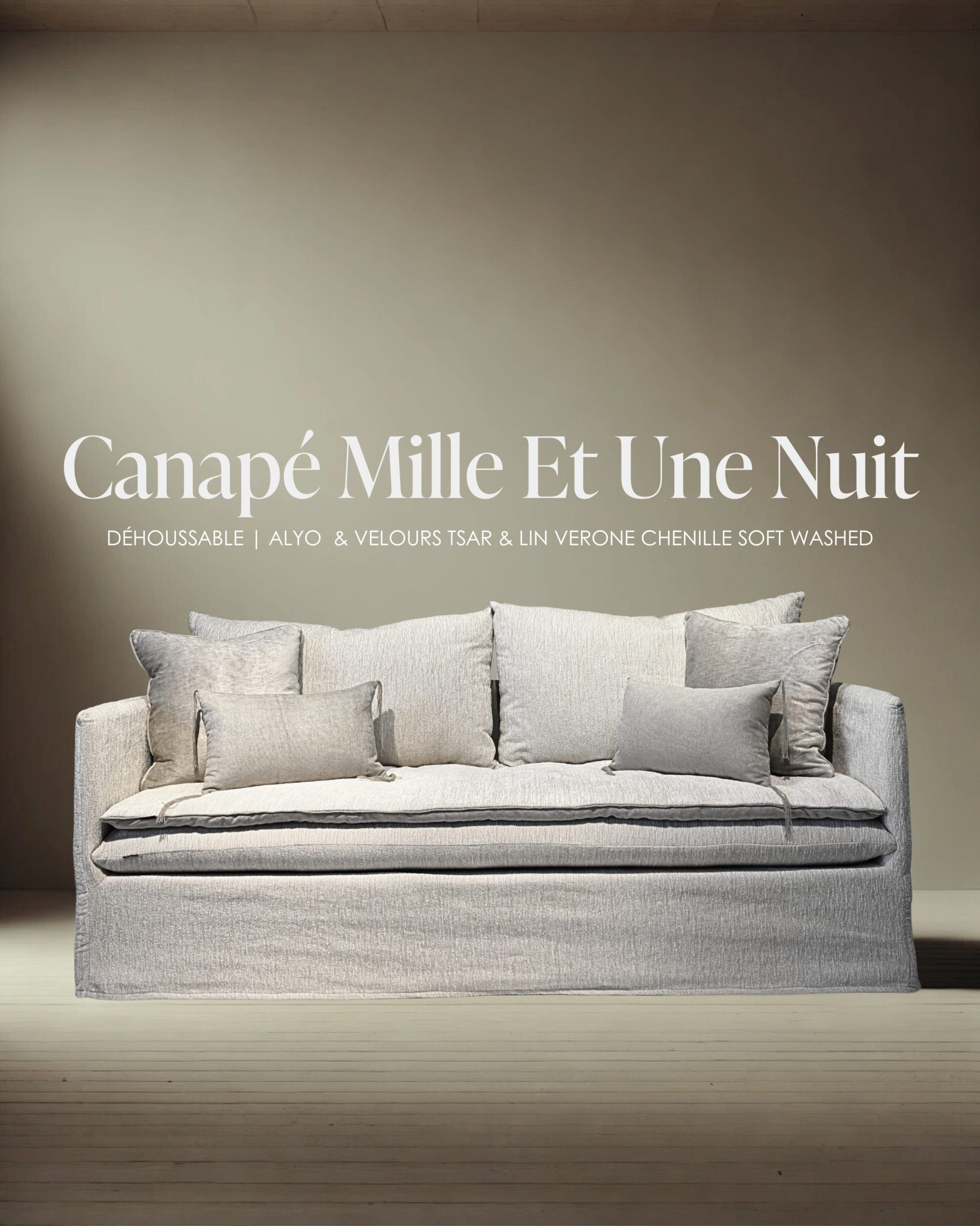 Avant d’entrer en collection, ce canapé a été conçu comme la première pièce d’exploration textile, pensée pour sublimer notre nouveau tissu Alyo dans un accord chromatique raffiné avec le velours Tsar sable et le lin Verone chenille soft washed ciment.