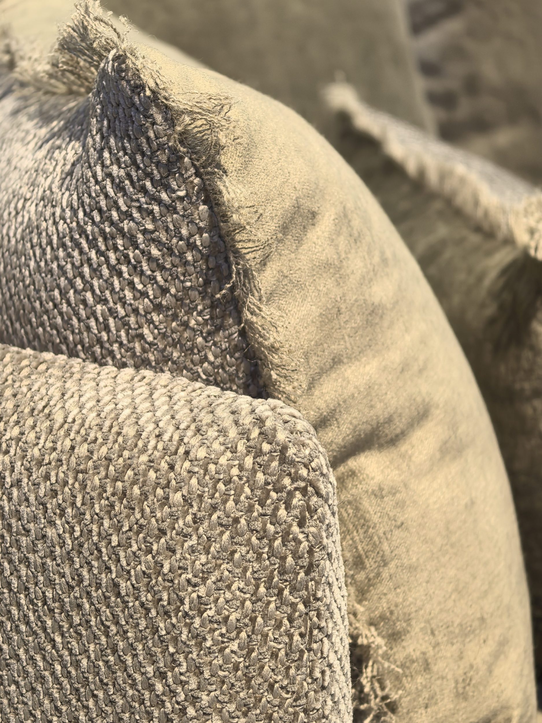 Il met en lumière le nouveau tissu Saba, en grège, dans un accord chromatique subtil avec le velours Tsar fumé et nos finitions Cheyenne en lin naturel, frangées à la main.