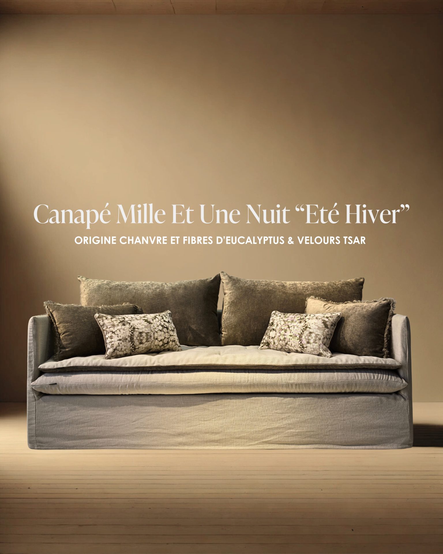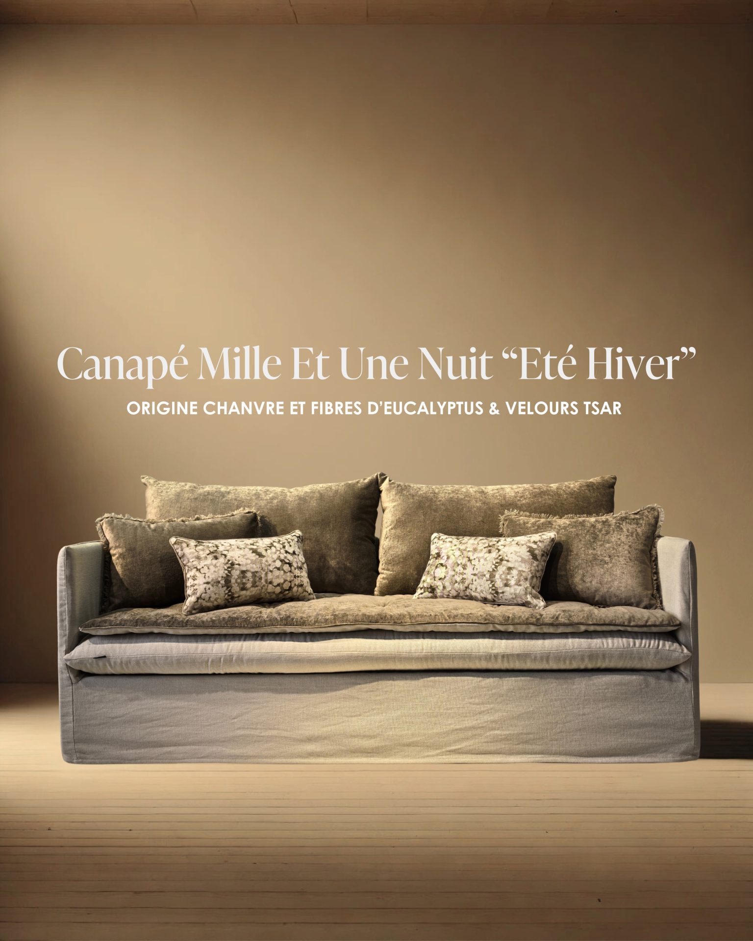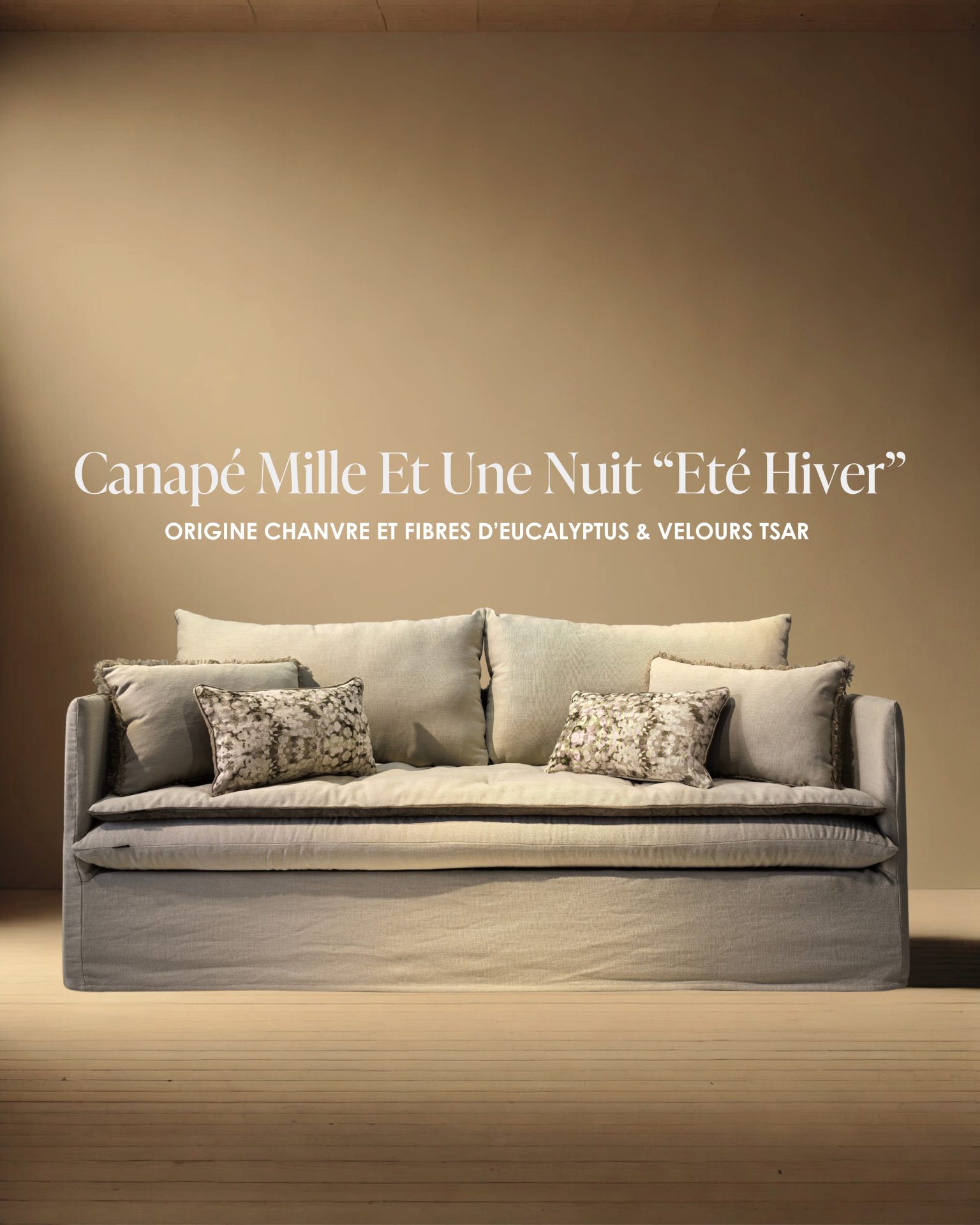 Avant d’entrer en collection, ce canapé a été conçu comme la première pièce d’exploration textile, pensée pour sublimer notre nouveau tissu naturel en chanvre & fibres d’eucalyptus Origine.