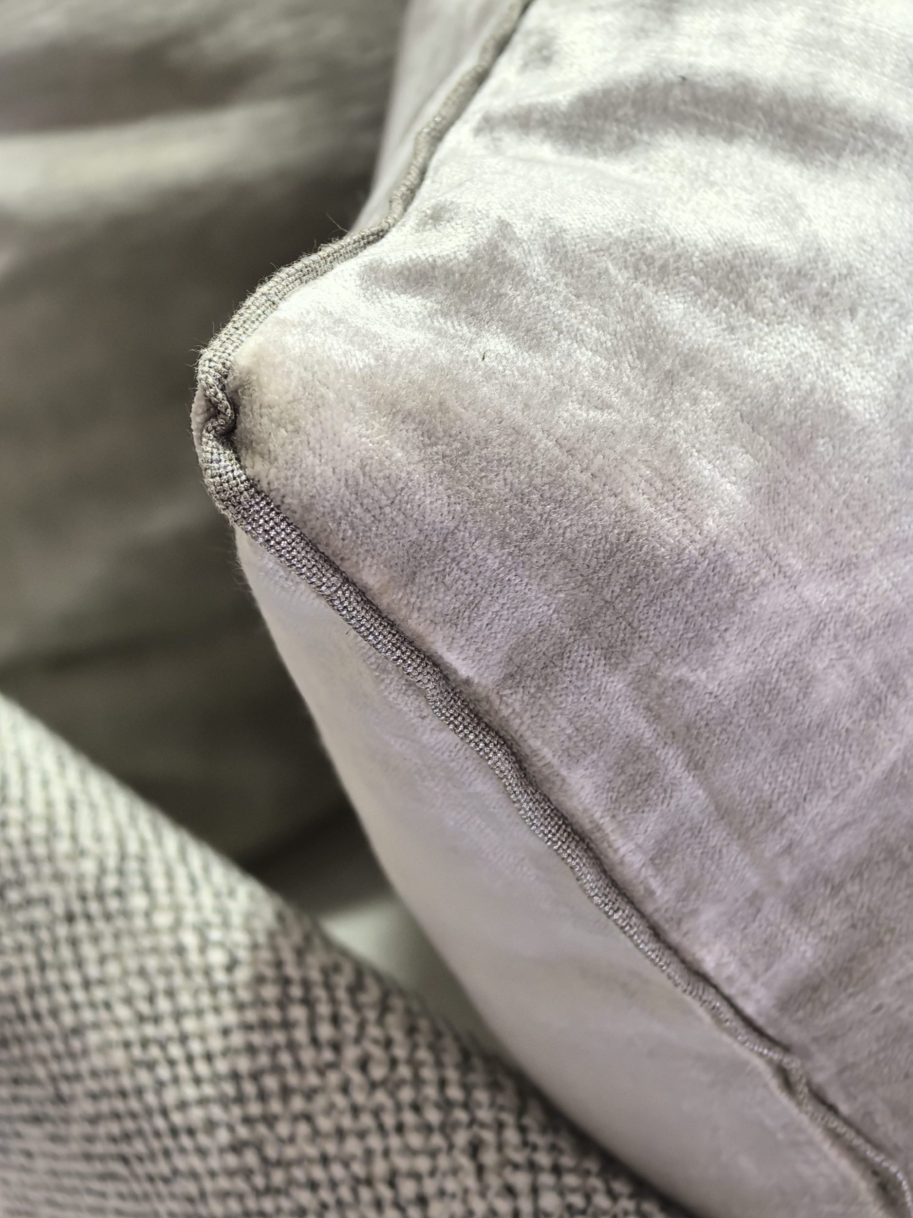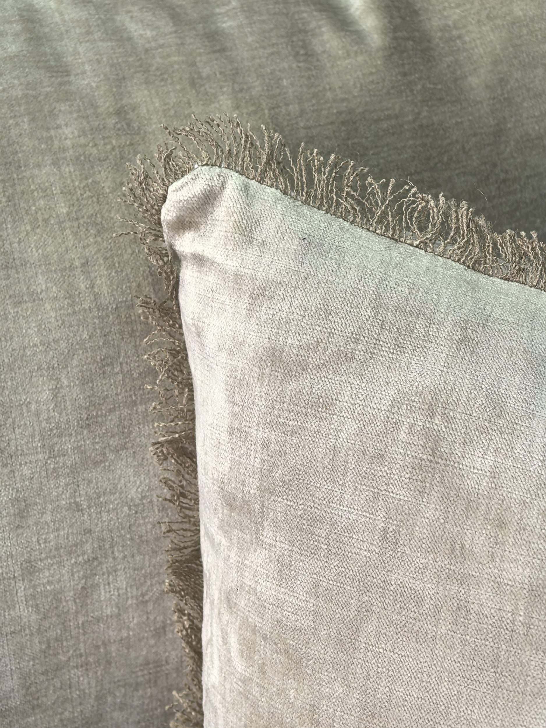 2 grands coussins de dossier recto velours Tsar sable verso lin Alaska finition bord à bord