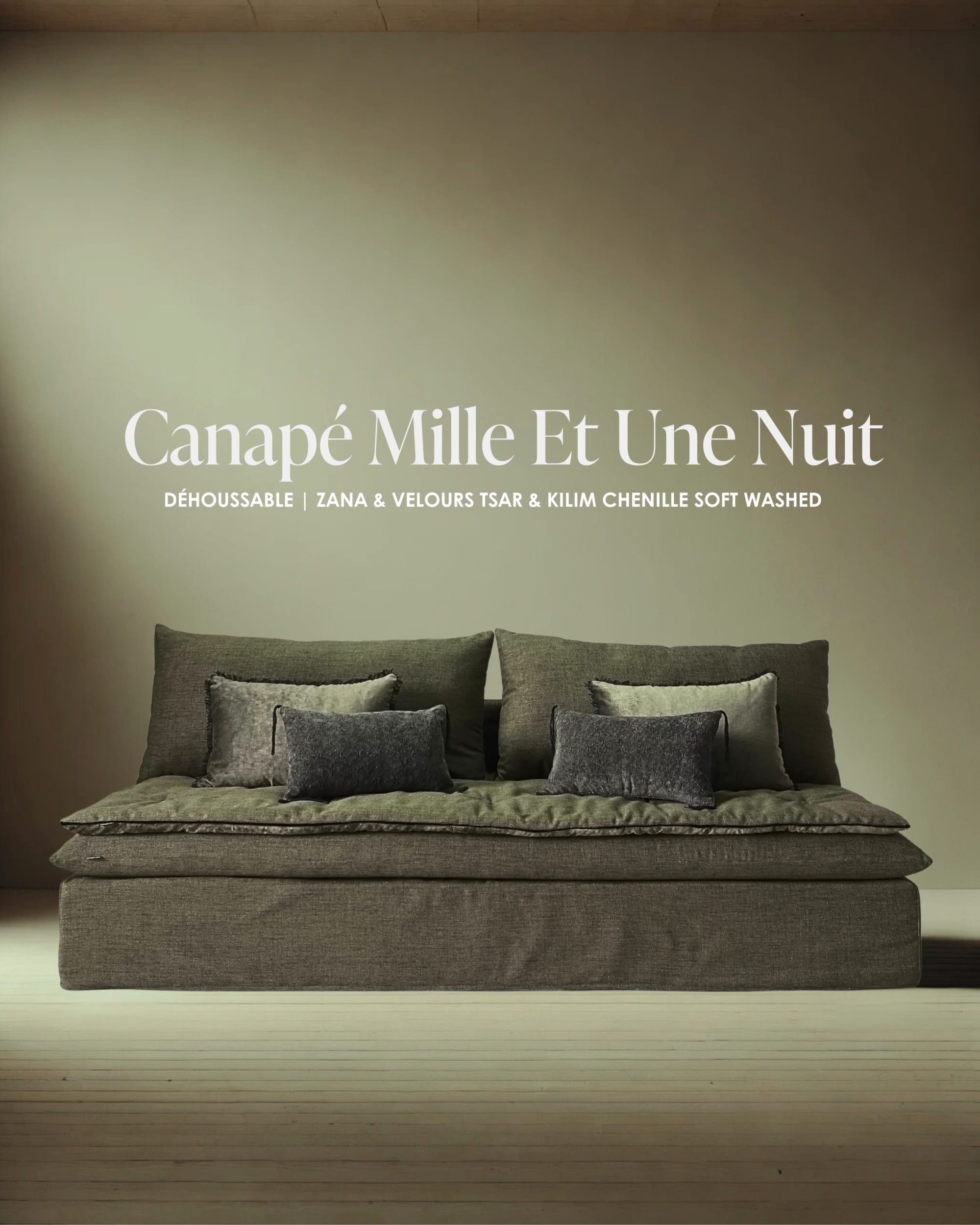 Avant d’entrer en collection, le canapé Mille Et Une Nuit devient le terrain d’expression de notre cheminement artistique ; pièce iconique de la Maison, il accueille aujourd’hui Zana, notre nouveau tissu, exploré à travers une harmonie chromatique subtile avec notre velours Tsar et notre Kilim chenille soft washed kaki.