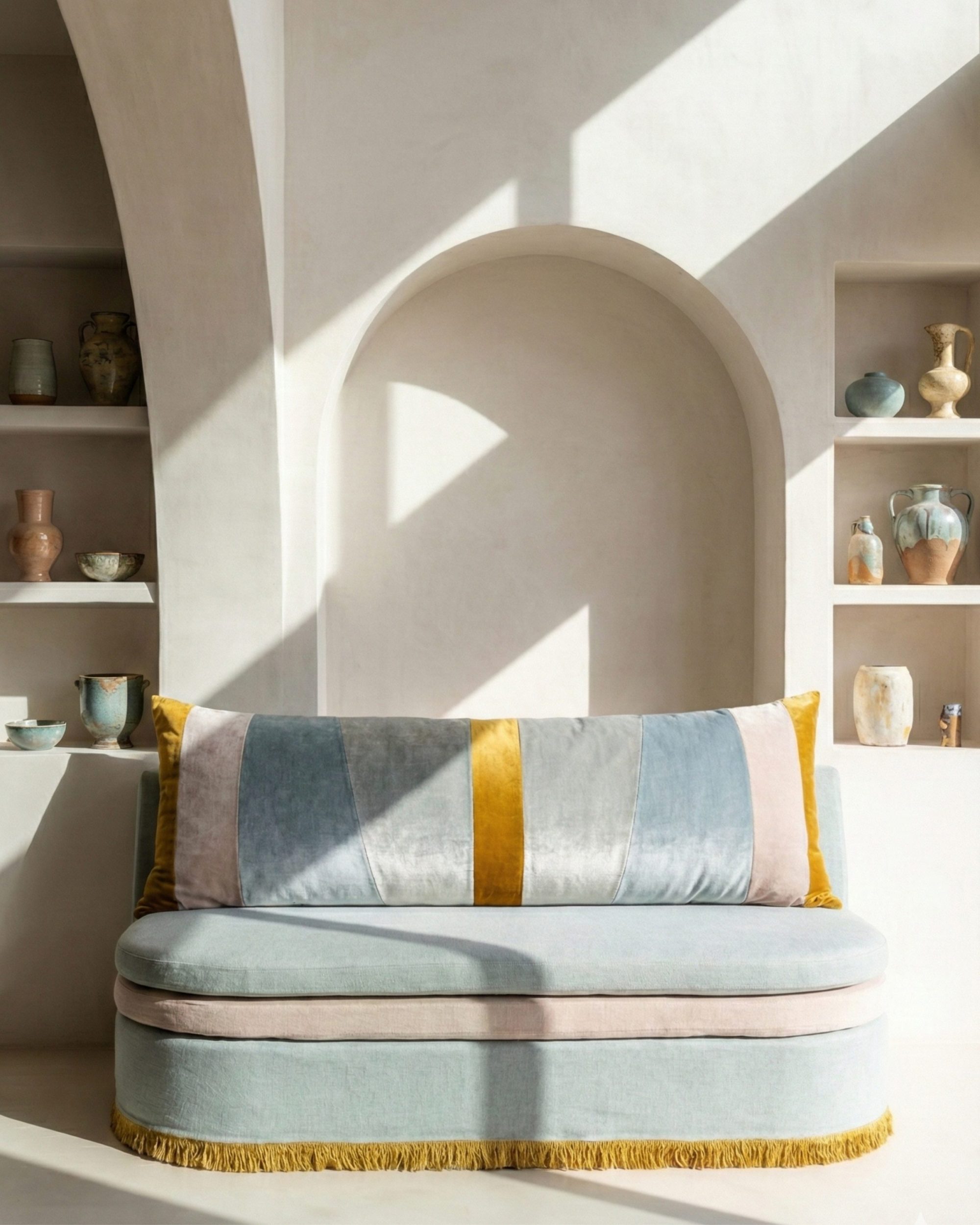 L’iconique Canapé Mille Et Une Nuit 5 Collection “Couture” Ipanema Ice y est sublimé par ses coussins, sur lesquels sont façonnés des empiècements en velours Tsar, gold, givré, glacier et thé, telles de véritables pièces d’artisanat d’art.
