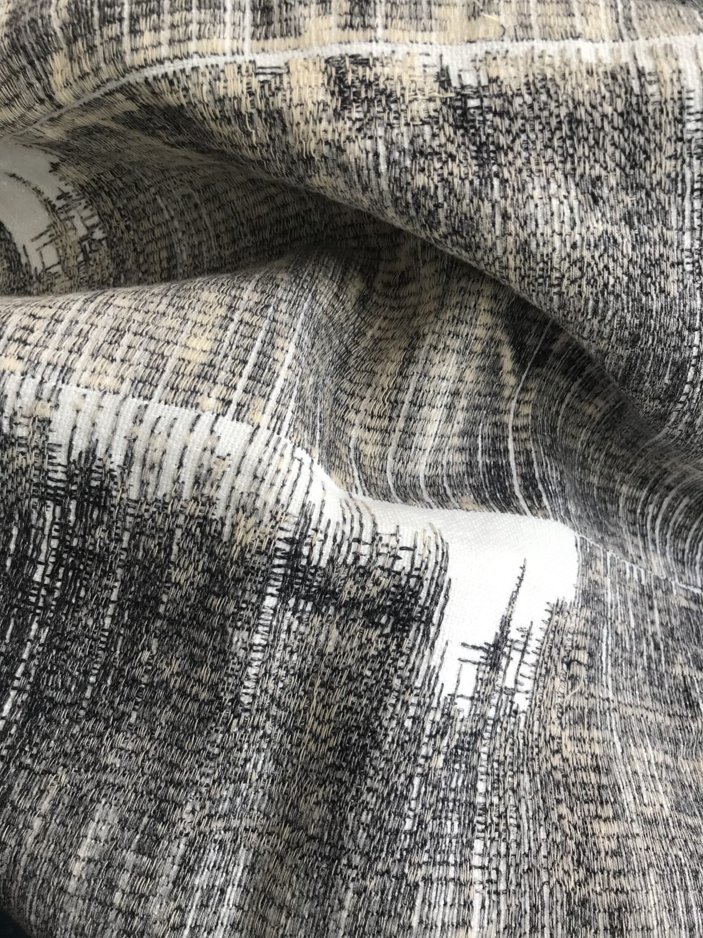Variation textile comme une partition légère, Arpège fusionne des fils aux nuances minérales pour composer une broderie moderne et intemporelle, subtilement posée sur un lin délicat.