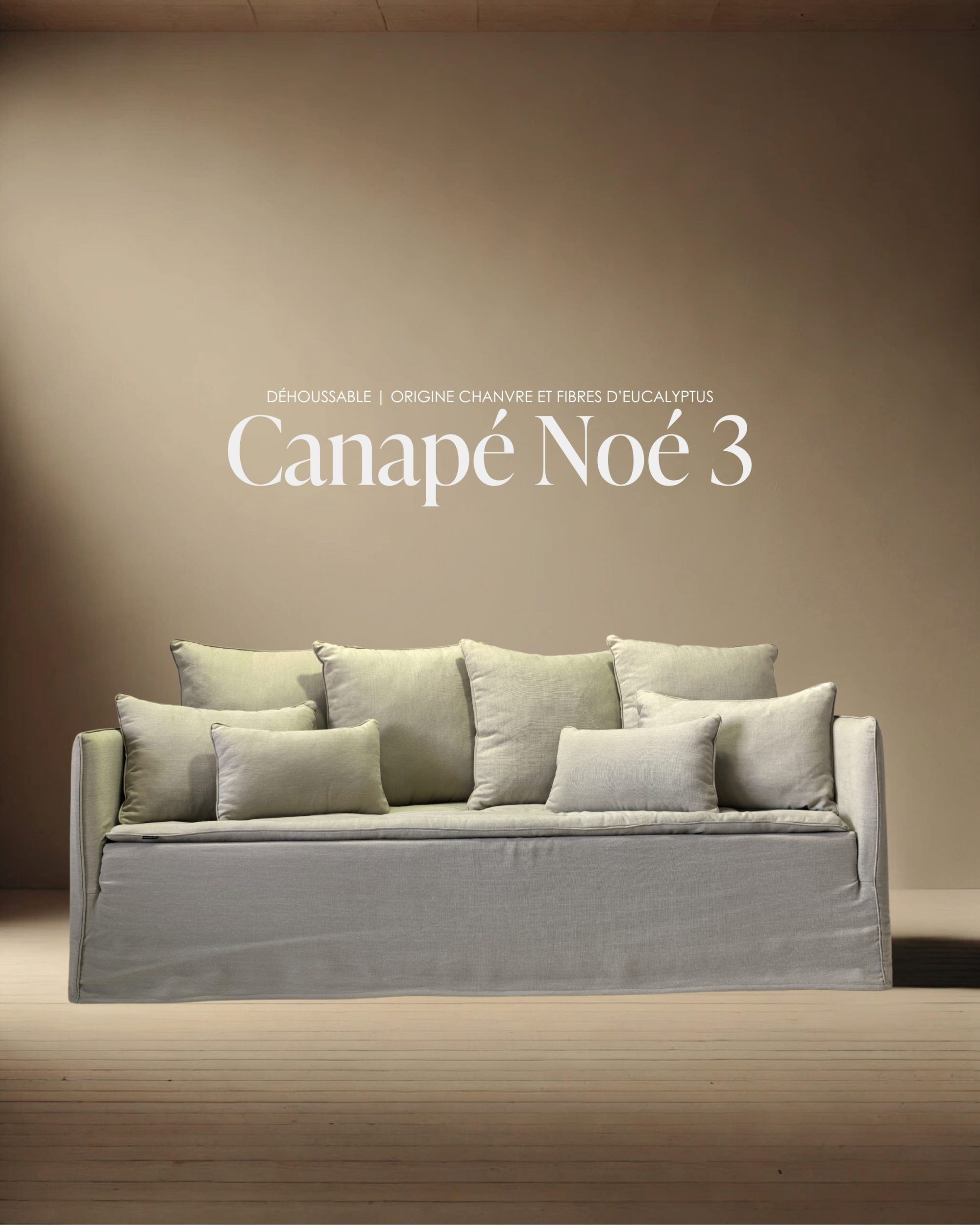 Ce canapé Noé 2, proposé en Offre Privilège, incarne cette démarche ; habillé du tissu Origine, une alliance noble de chanvre et de fibres d’eucalyptus, il offre une texture à la fois structurée et soyeuse.