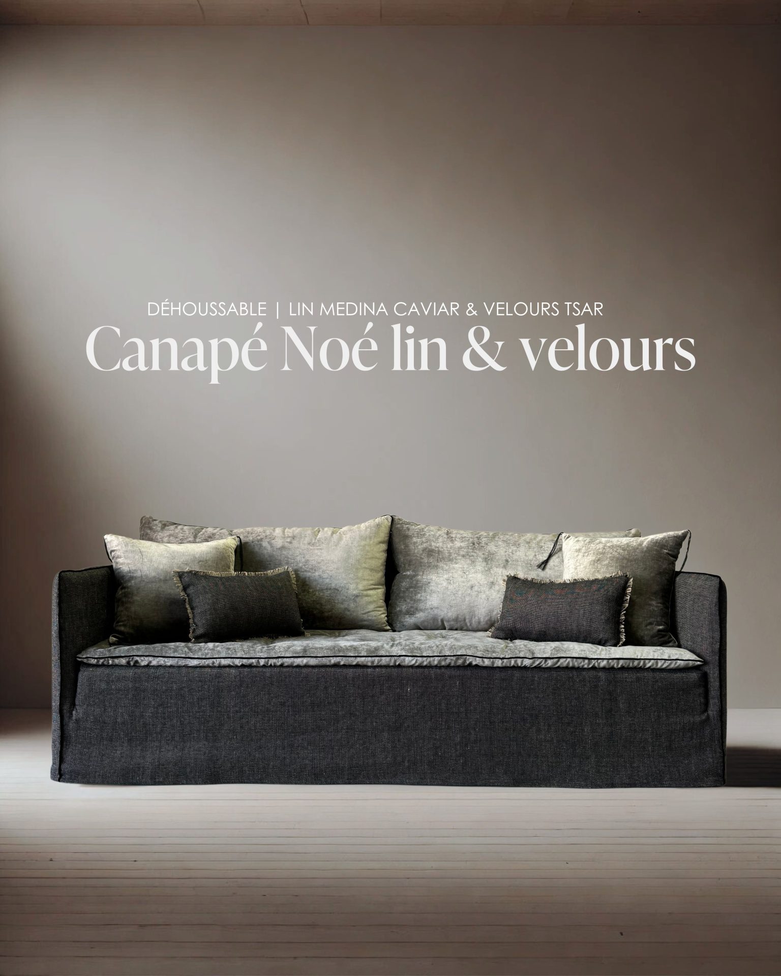 Canapé Noé 240 cm lin jute Medina caviar et velours Tsar écorce