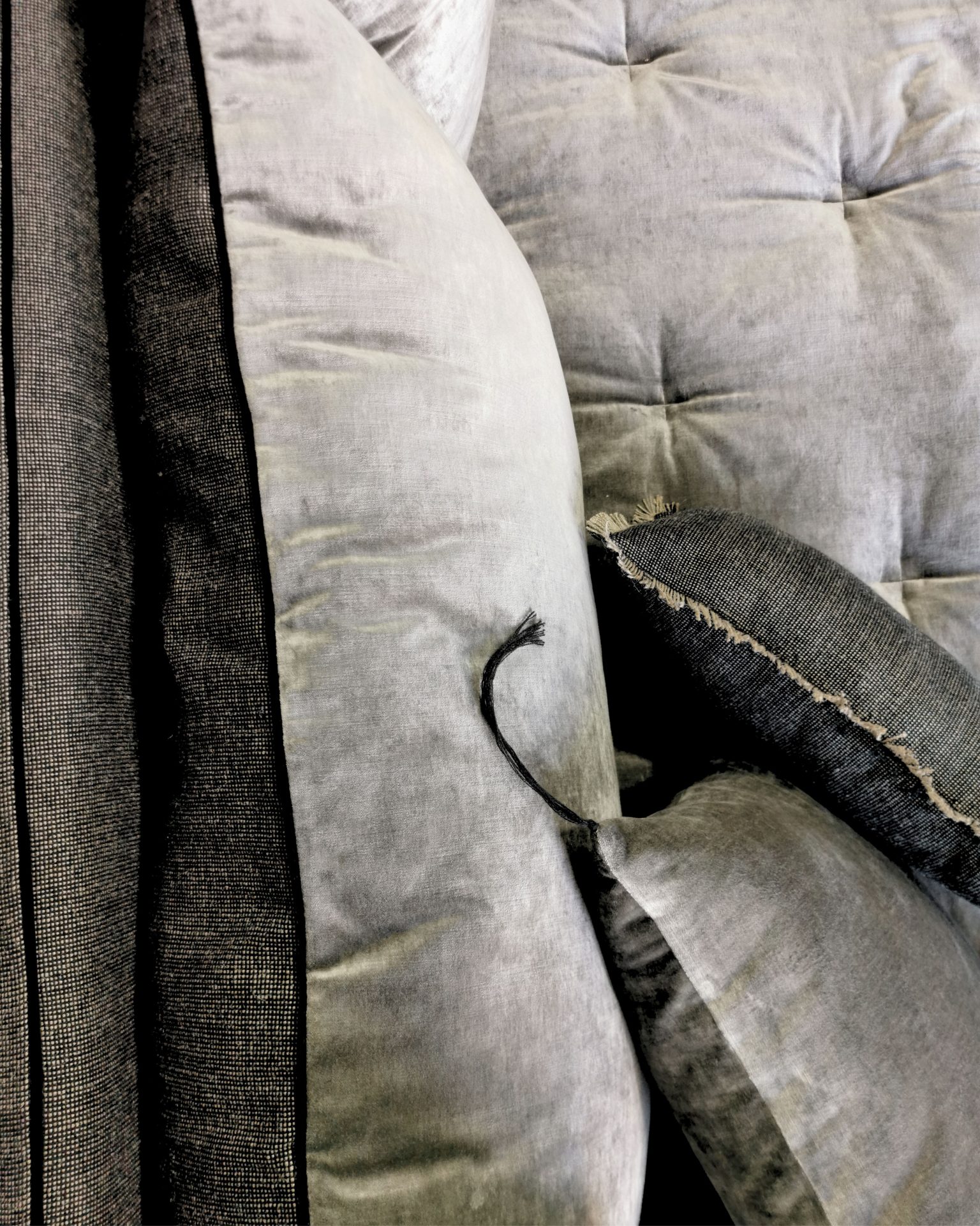 2 grands coussins de dossier recto velours Tsar écorce verso lin Médina caviar finition liseret velours noir