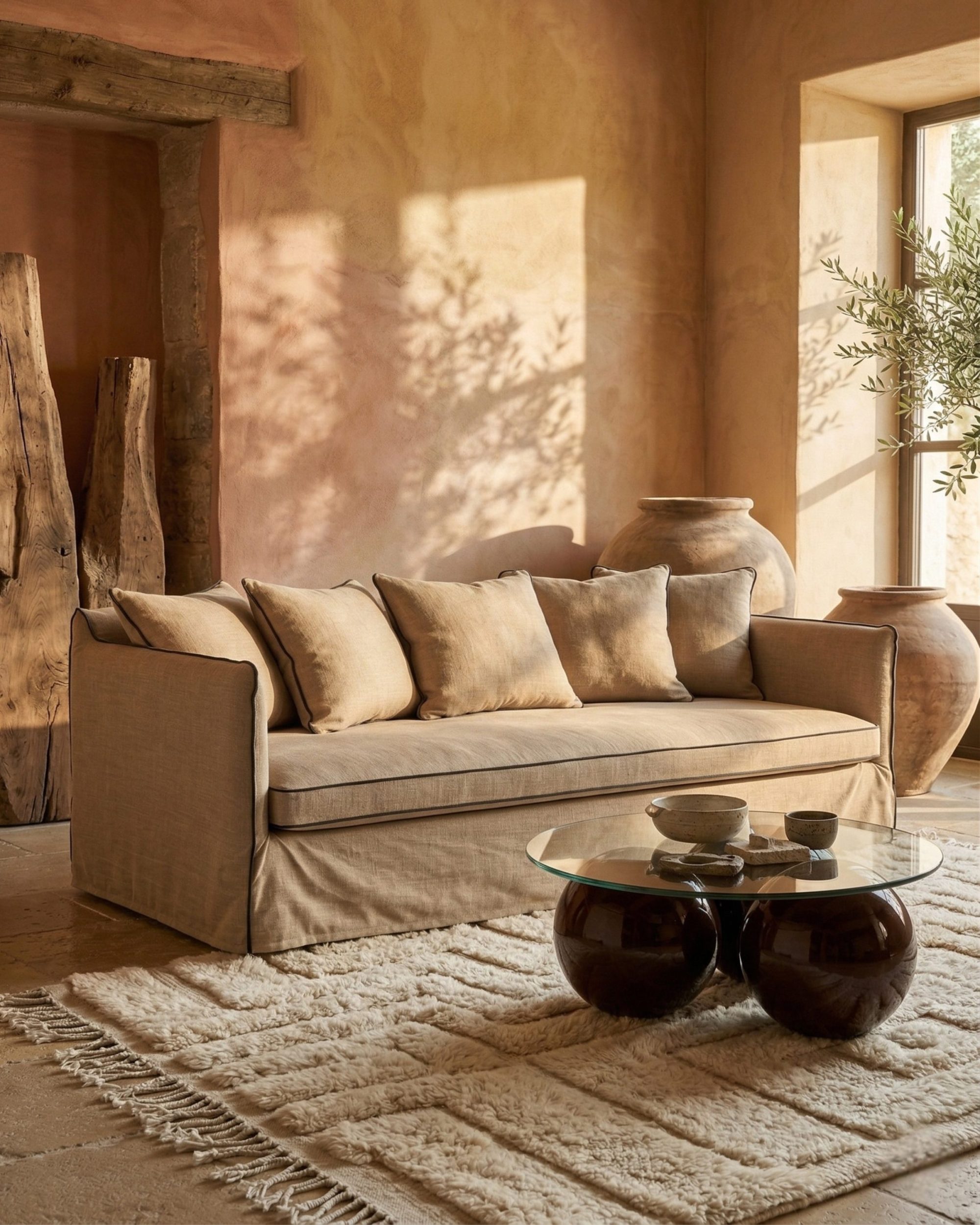 Expression d’un art de vivre Slow Living en Provence, Canapé Noé 3 en lin lavé Sable révèle une élégance essentielle, ses lignes apaisées dessinent un refuge silencieux, tandis que son lin, vivant et légèrement texturé, capte la lumière et évolue au fil du temps, créant une présence douce, profondément ancrée dans la matière.