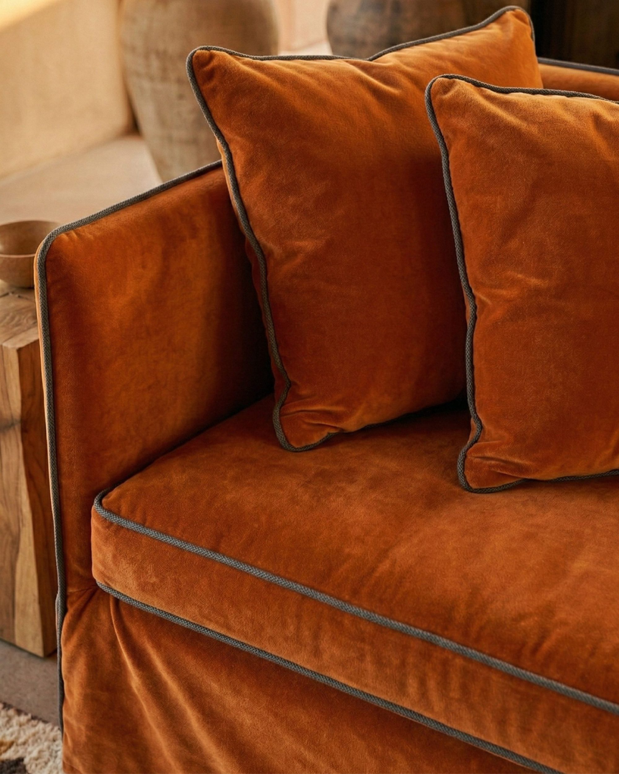 Accueil / ACCESSOIRES DE DECORATION / TABLES BASSES / Canapé Noé 3 en velours Orange Brûlé