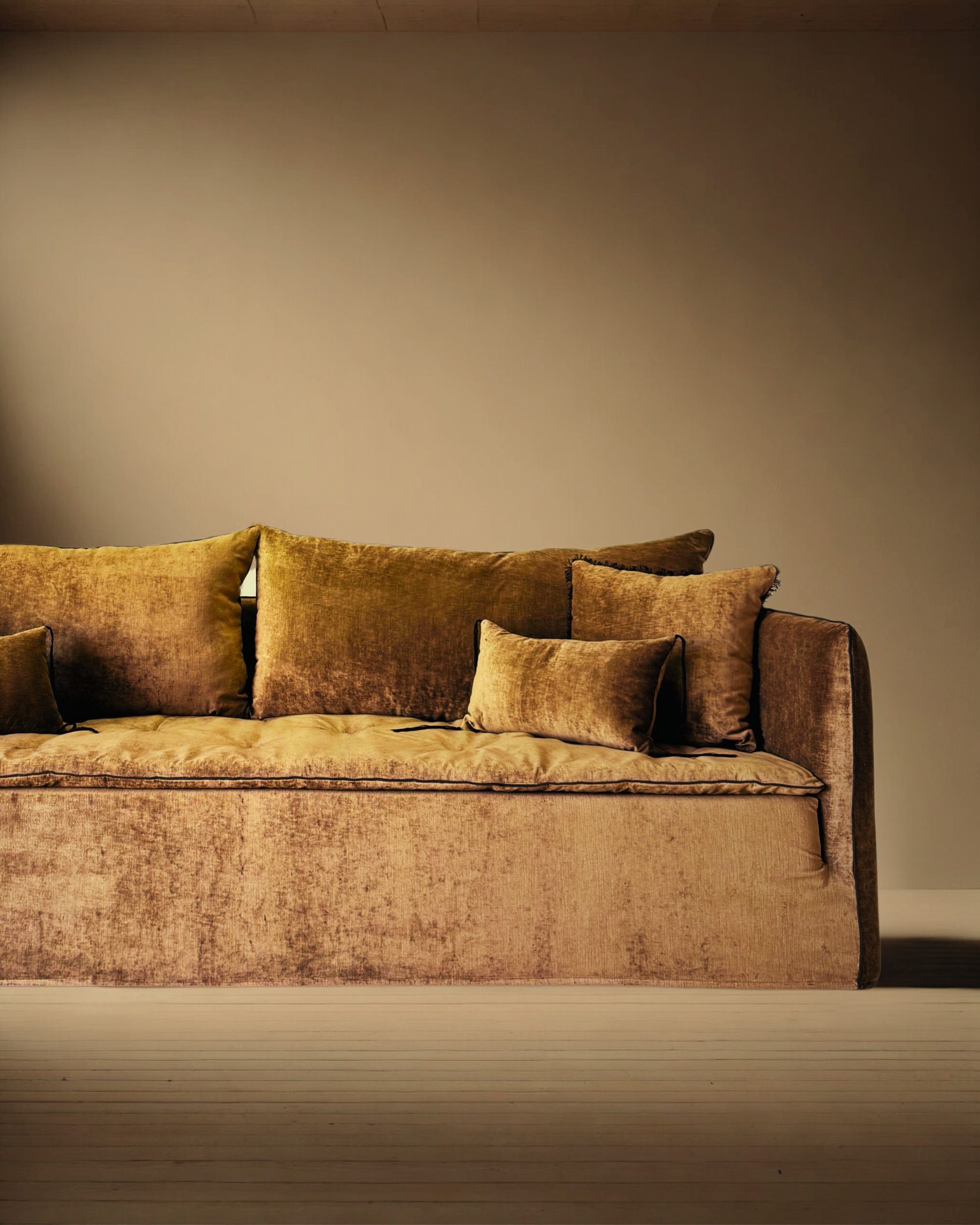 Sa silhouette épurée et généreuse incarne un art de vivre bohème sophistiqué tandis que le velours Tsar, matière signature, capte la lumière avec des reflets profonds et patinés.