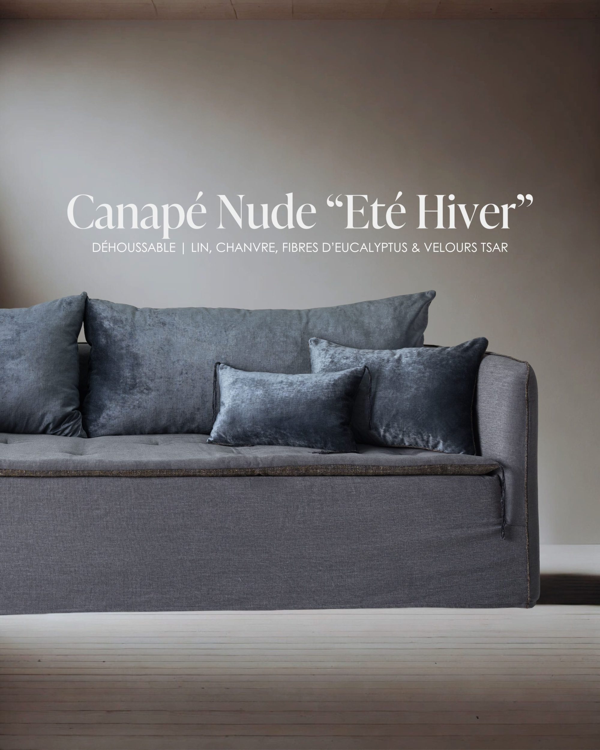 Canapé Nude Origine chanvre & fibres d’eucalyptus, velours Tsar Abyss & lin Glam fumé 260 cm