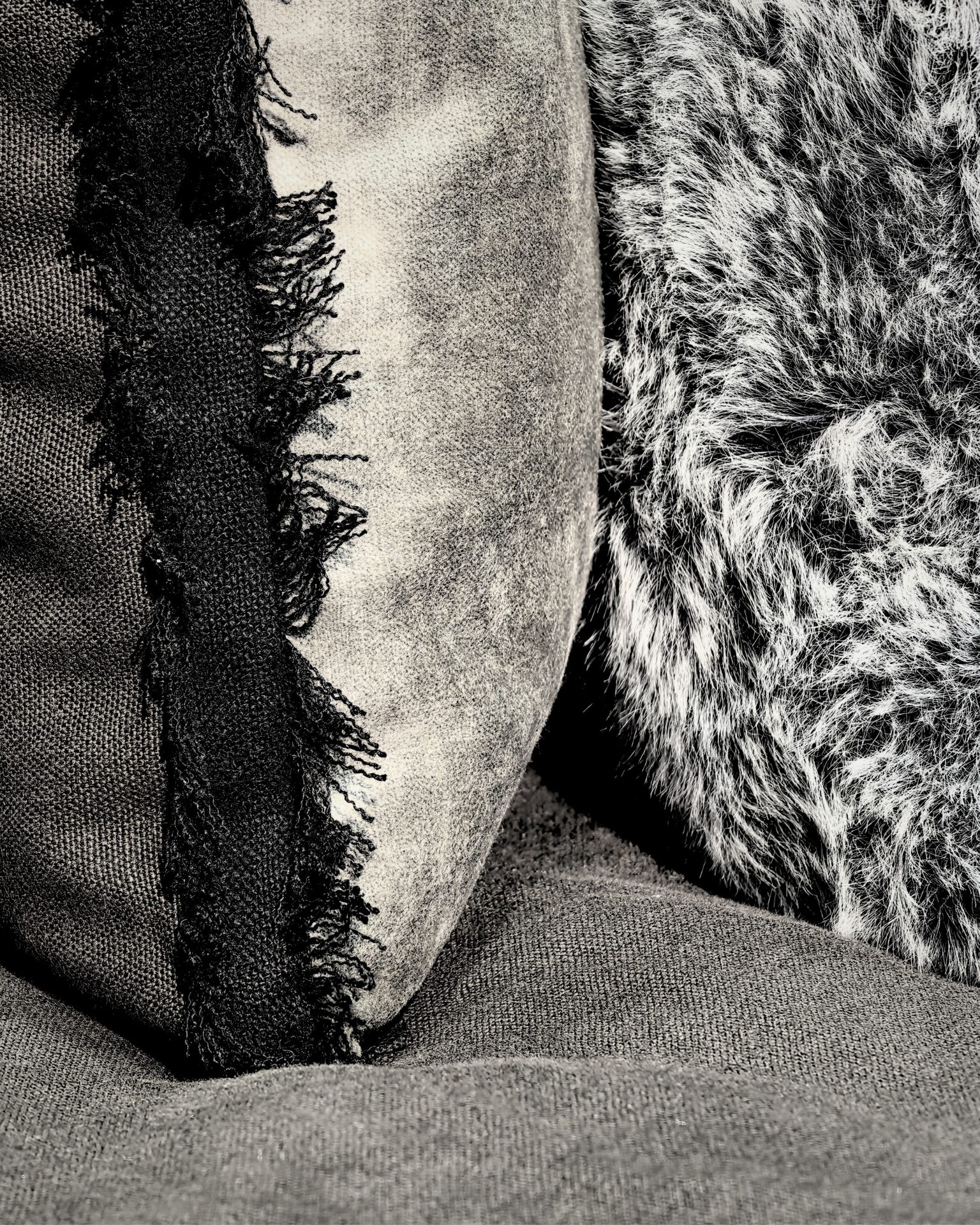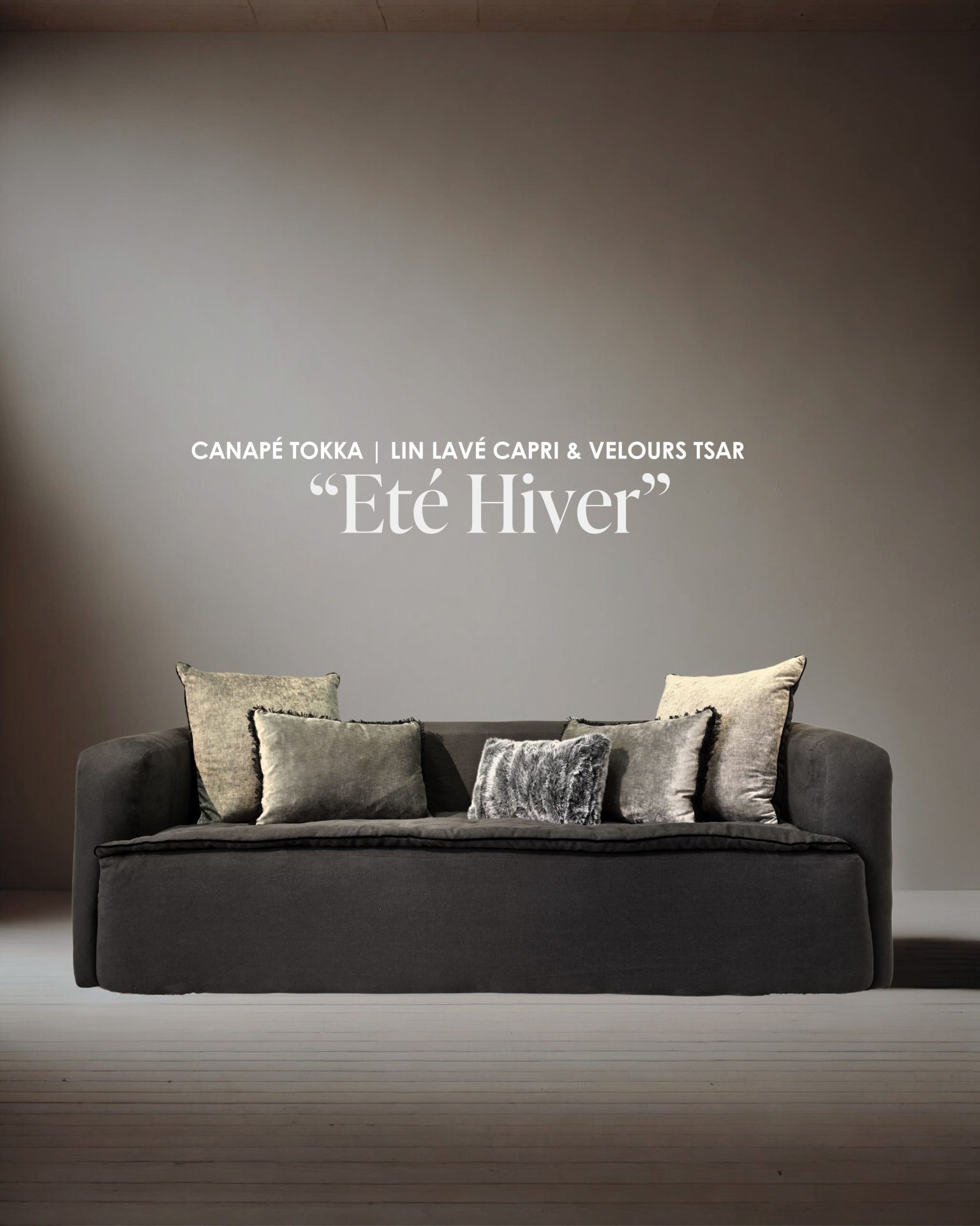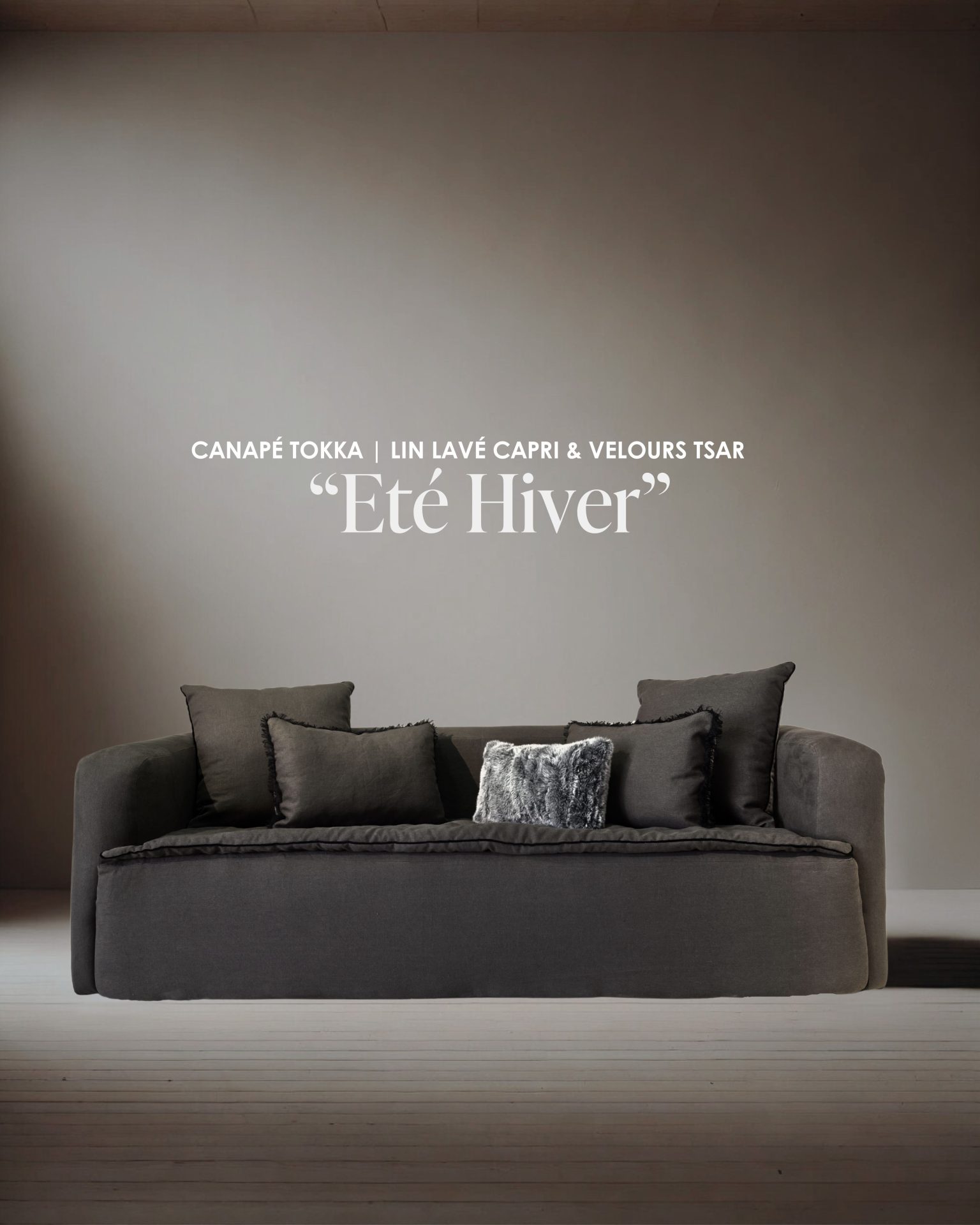Le canapé Tokka est habillé du lin lavé Capri dans une teinte aujourd’hui devenue collector, le carbone.