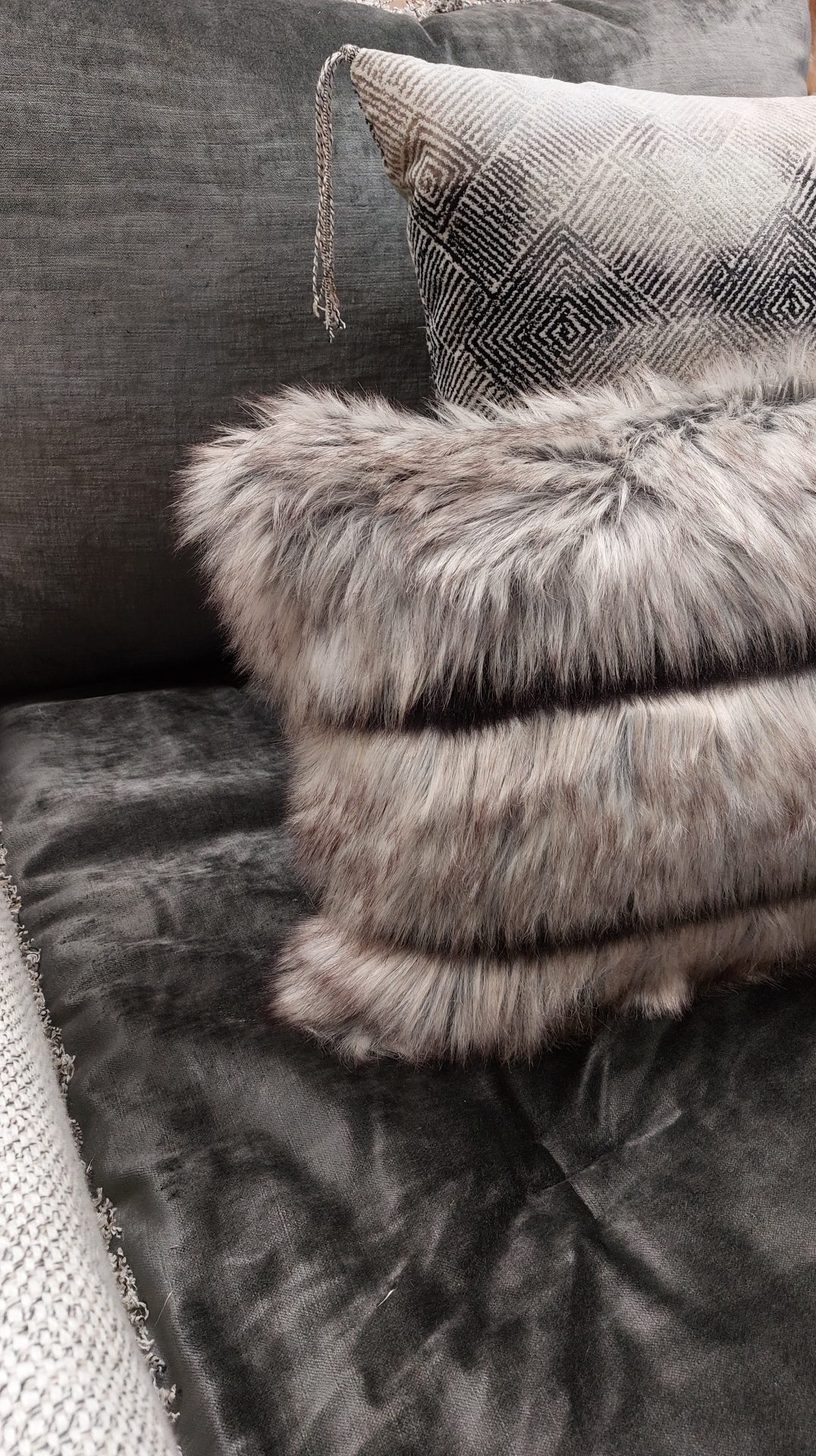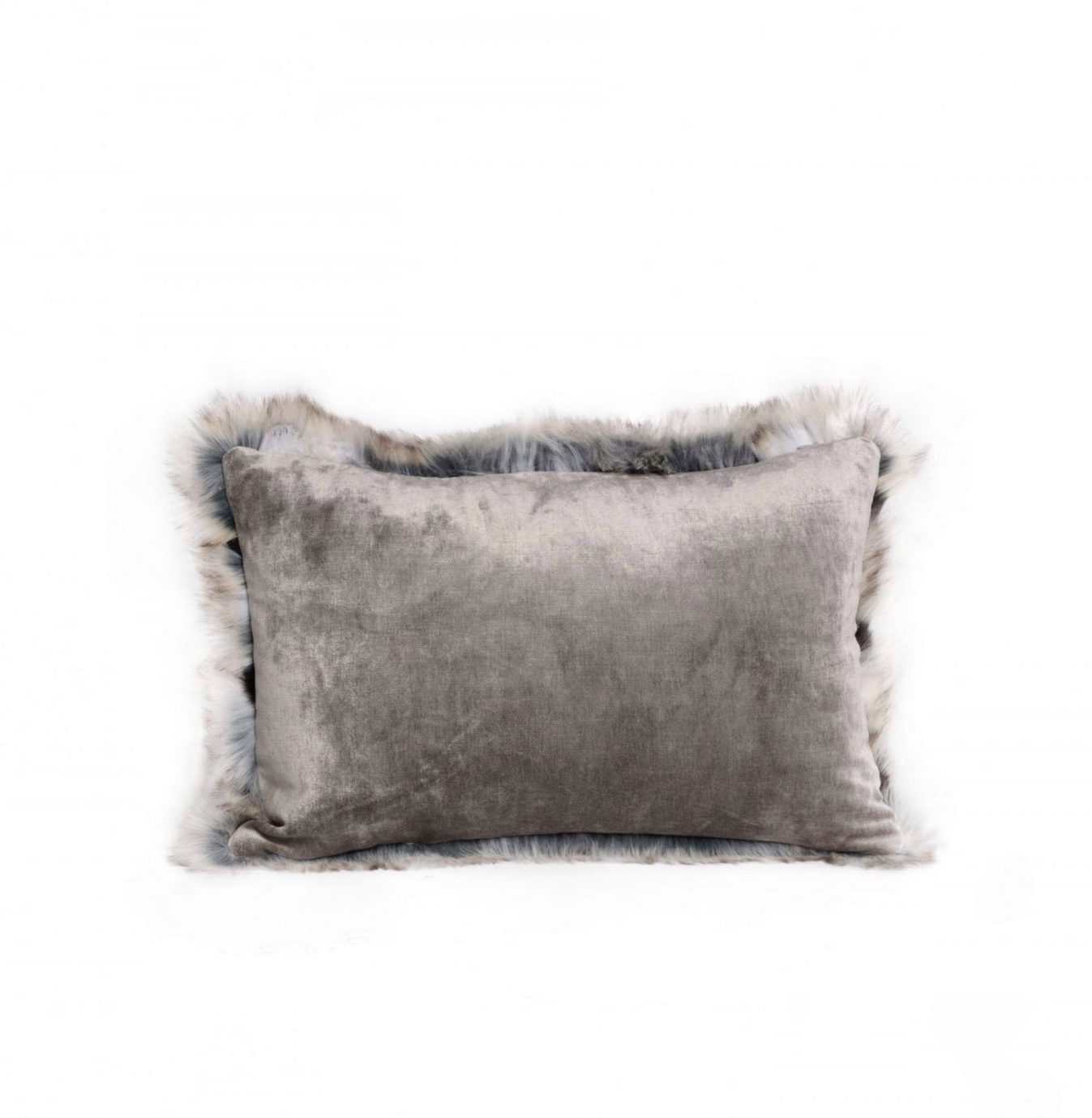 Coussin recto velours tsar gris galet fourrure Alaska finition bord à bord