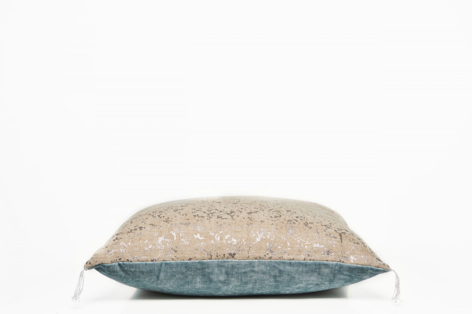 Coussin Miss Bohème Argent – Recto lin argenté verso velours bleu glacier