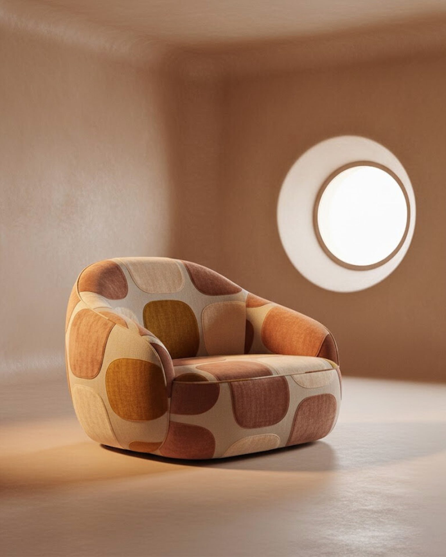 Des bulles de velours dansent sur un lin sable dans une esthétique à la fois ludique et sophistiquée, chaque pièce exprime un design d’émotion, entre artisanat couture et énergie joyeuse des années 70.