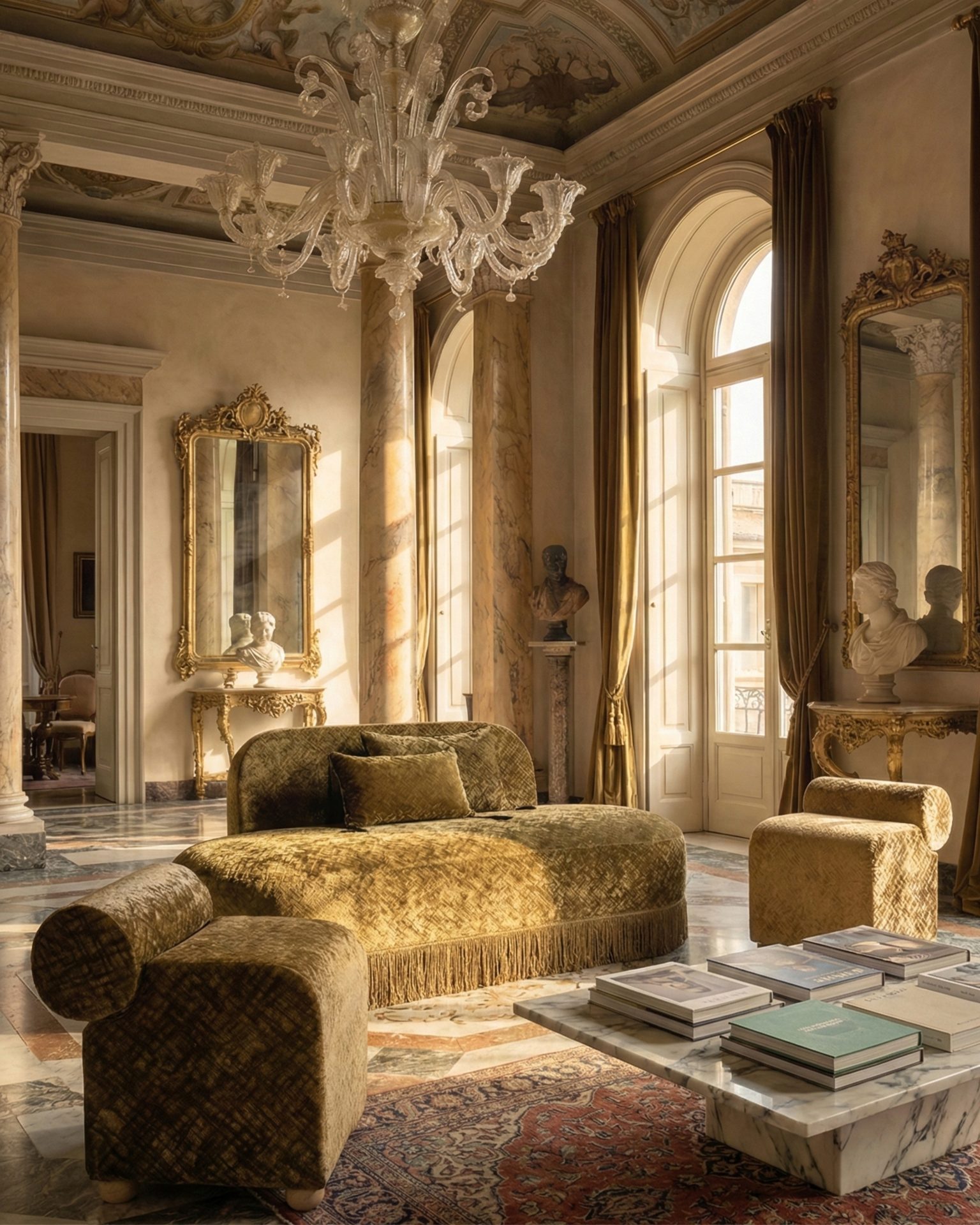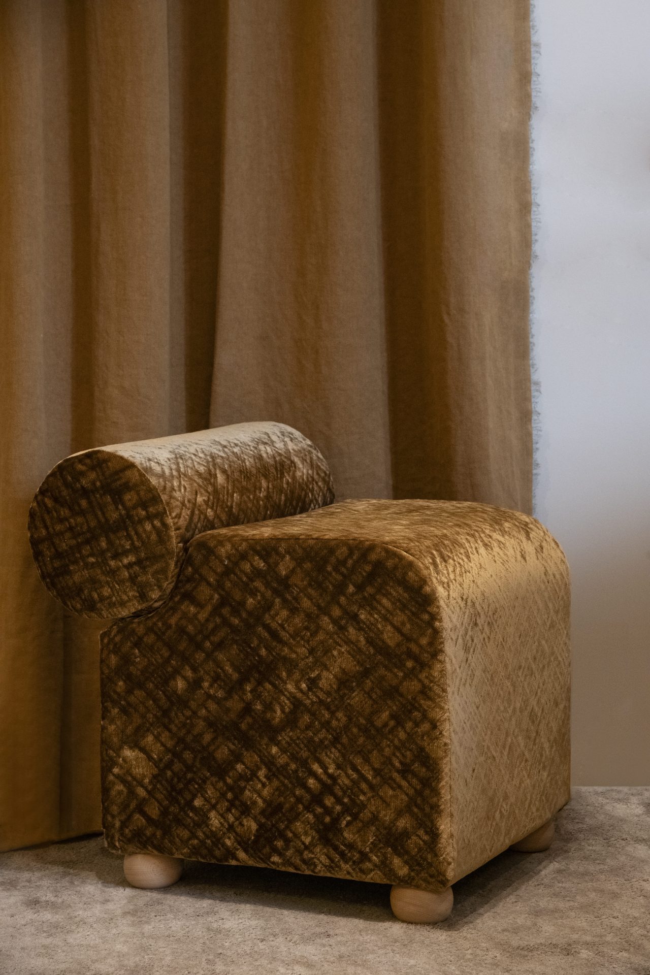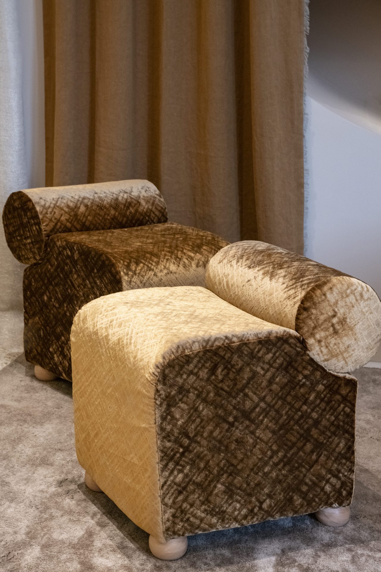 Le fauteuil Zéphyr joue avec les formes géométriques, l’équilibre et les reflets profonds du velours Quattrocento.