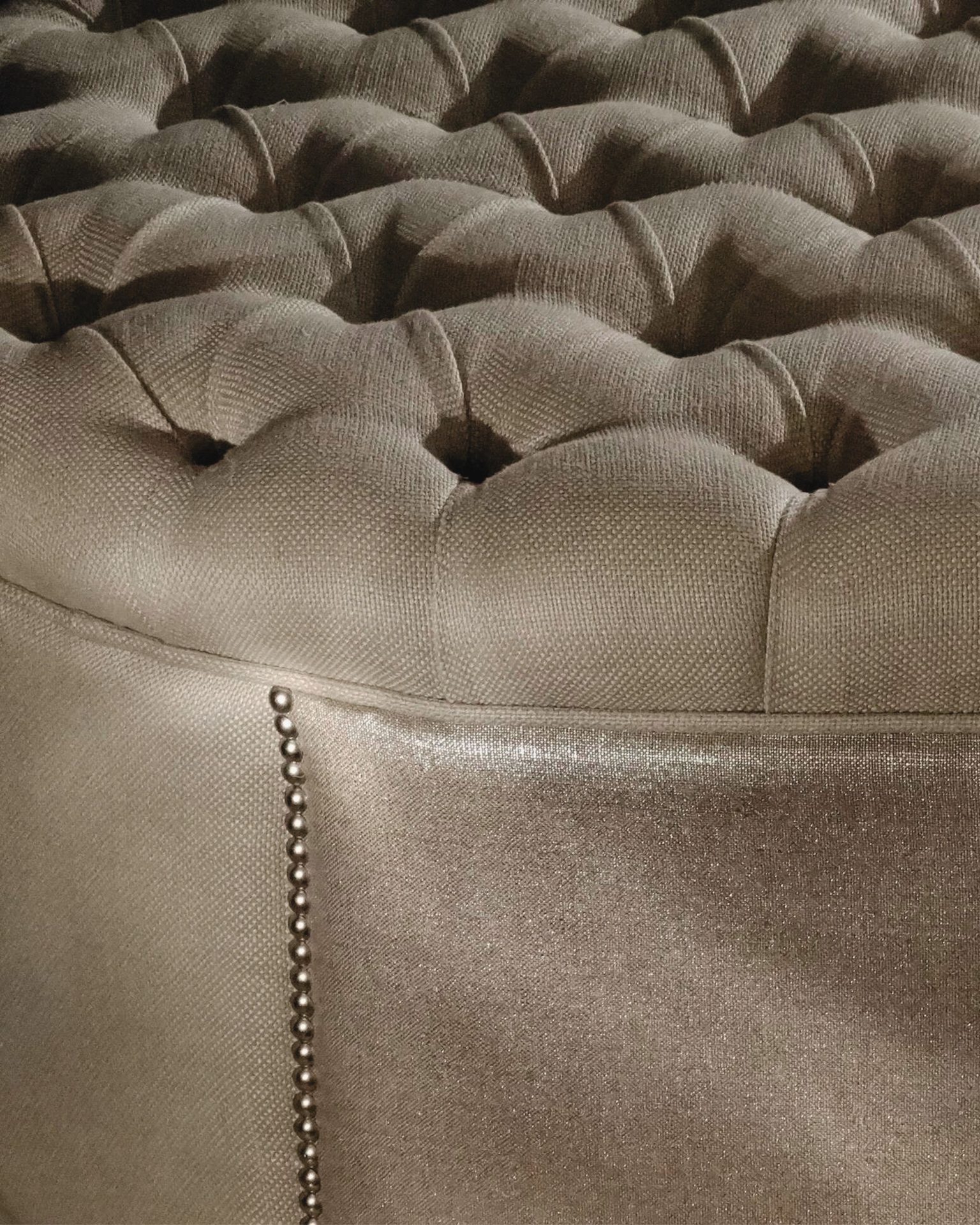 Son capiton délicatement dessiné, sa ligne enveloppante et l’éclat subtil de ses clous satinés composent un équilibre parfait entre sophistication et sérénité naturelle du lin.