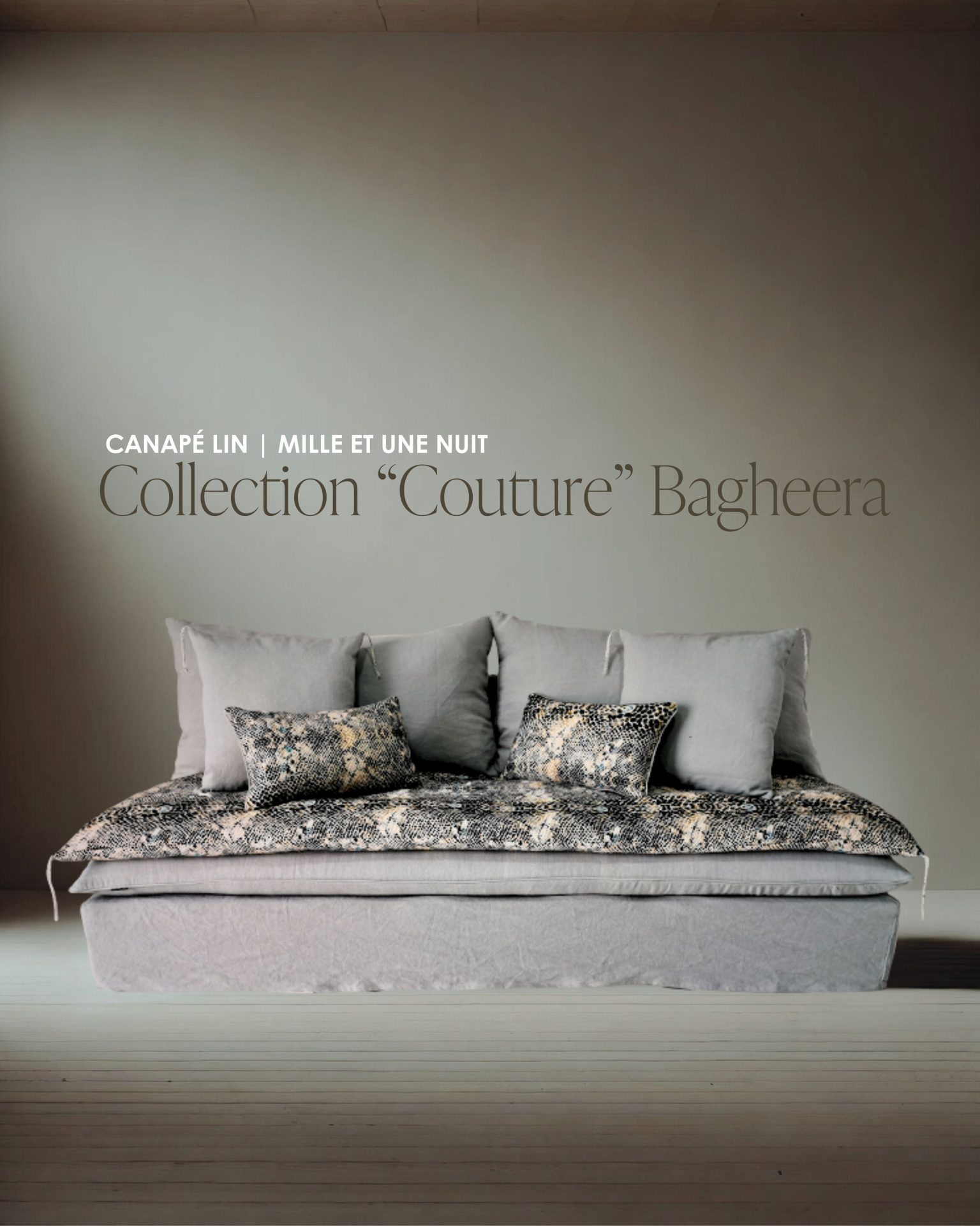 Accueil / Offres Privilèges / Canapé Mille Et Une Nuit 200 cm lin lavé Capri vert de gris et lin imprimé Bagheera