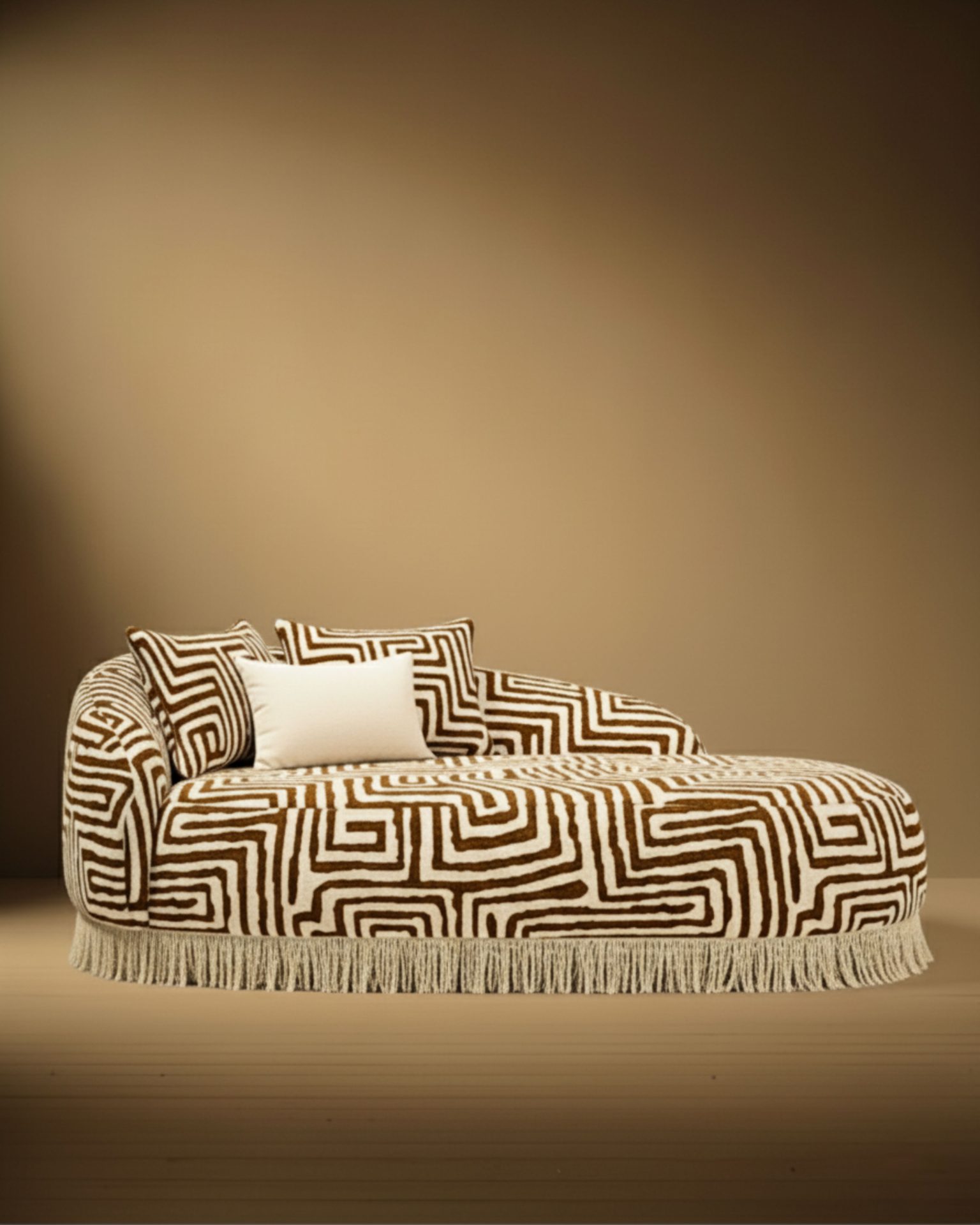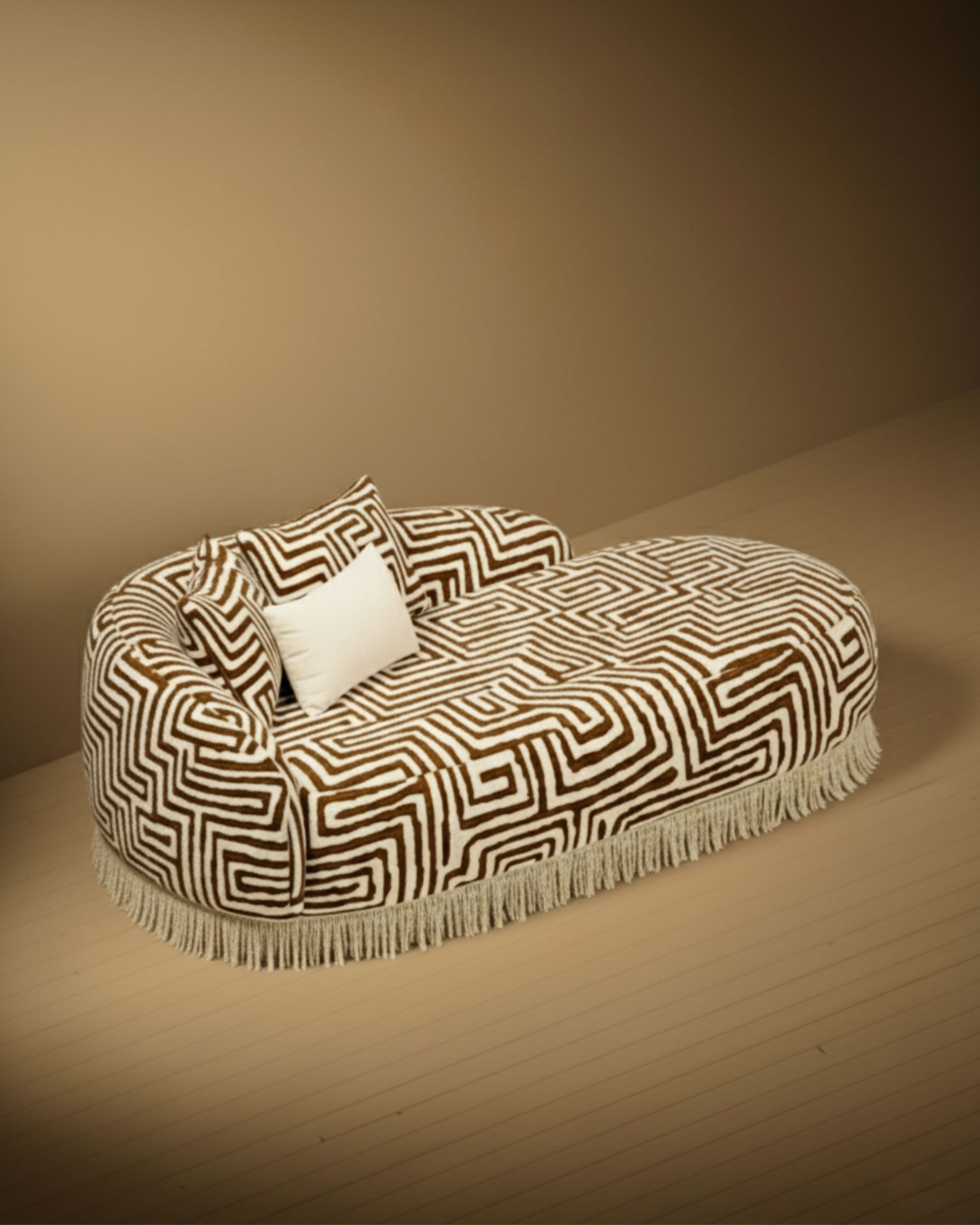Entre glamour bohême et élégance couture, une pièce de mode organique habillée du nouveau tissu Tobacco Shore.