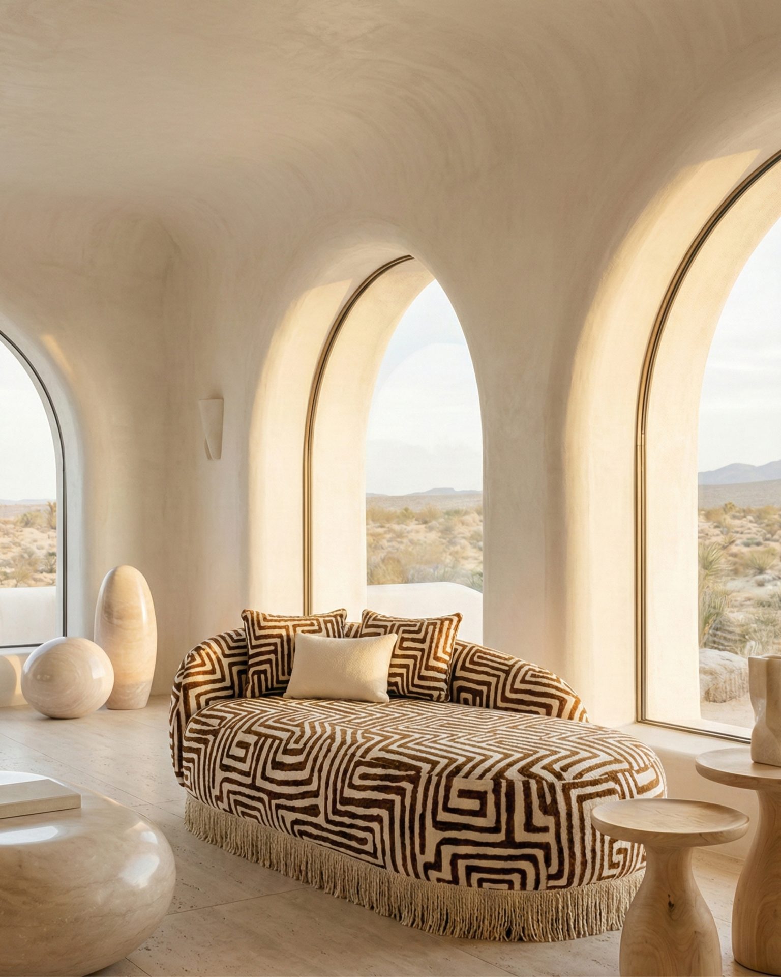 Entre glamour bohême et élégance couture, une pièce de mode organique habillée du nouveau tissu Tobacco Shore.
