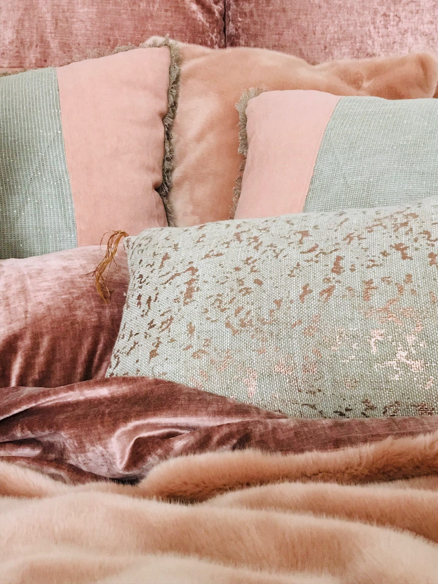 Le souffle doux du glamour tendre, qui mêle la douceur des velours Tsar et des ses roses nude, marsala, et romance au naturel précieux du lin Miss Bohême, subtilement cuivré.