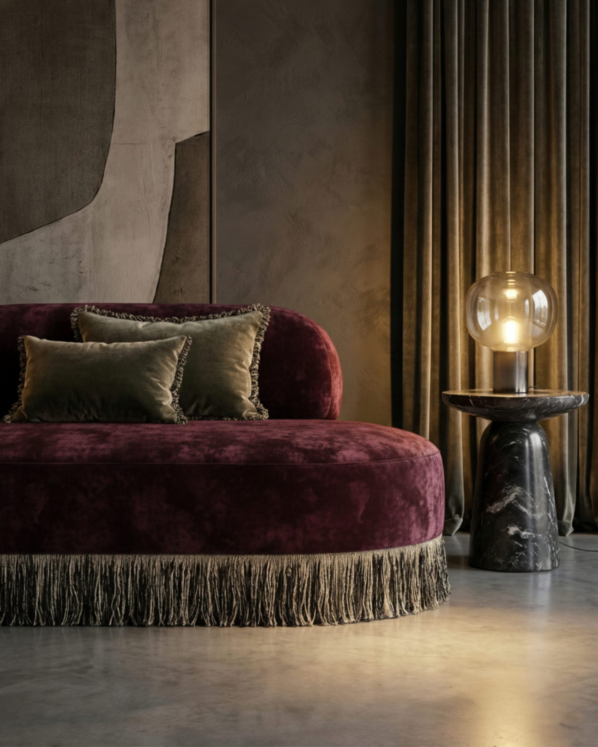 D’un côté, la profondeur sublime du velours Tsar Burgundy, noble et « couture » ; de l’autre, la présence organique du lin Medina, dont les franges nouées à la main apportent une authenticité brute.