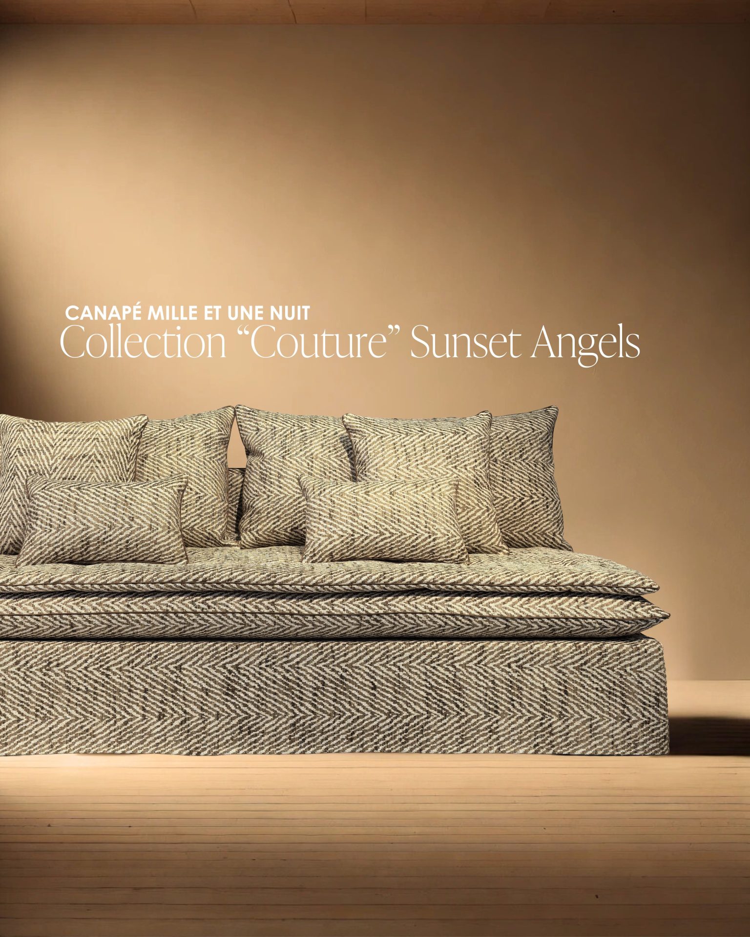 Un souffle Art Déco traverse l’étoffe SUNSET ANGELS, entre géométrie graphique et sensualité textile, lumière dorée et élégance bohême. A harmoniser avec nos velours Tsar, pour une palette solaire et sophistiquée, entre caramel, sable et or bruni.
