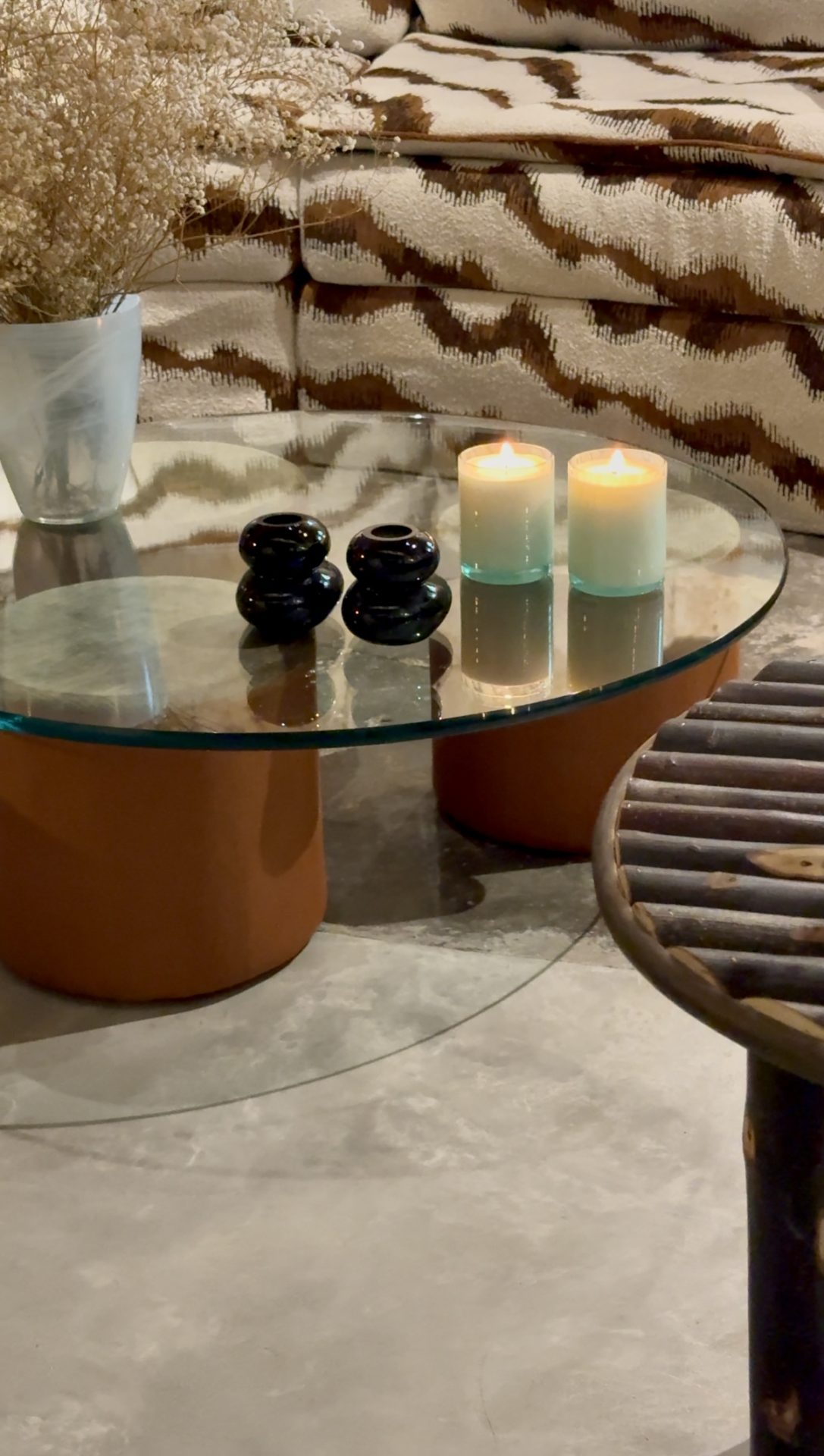 Chaque pied devient une colonne textile, sculptée dans la couleur, formant un lien visuel et tactile avec le reste de l’espace dans lequel le verre laisse le velours s’exprimer.