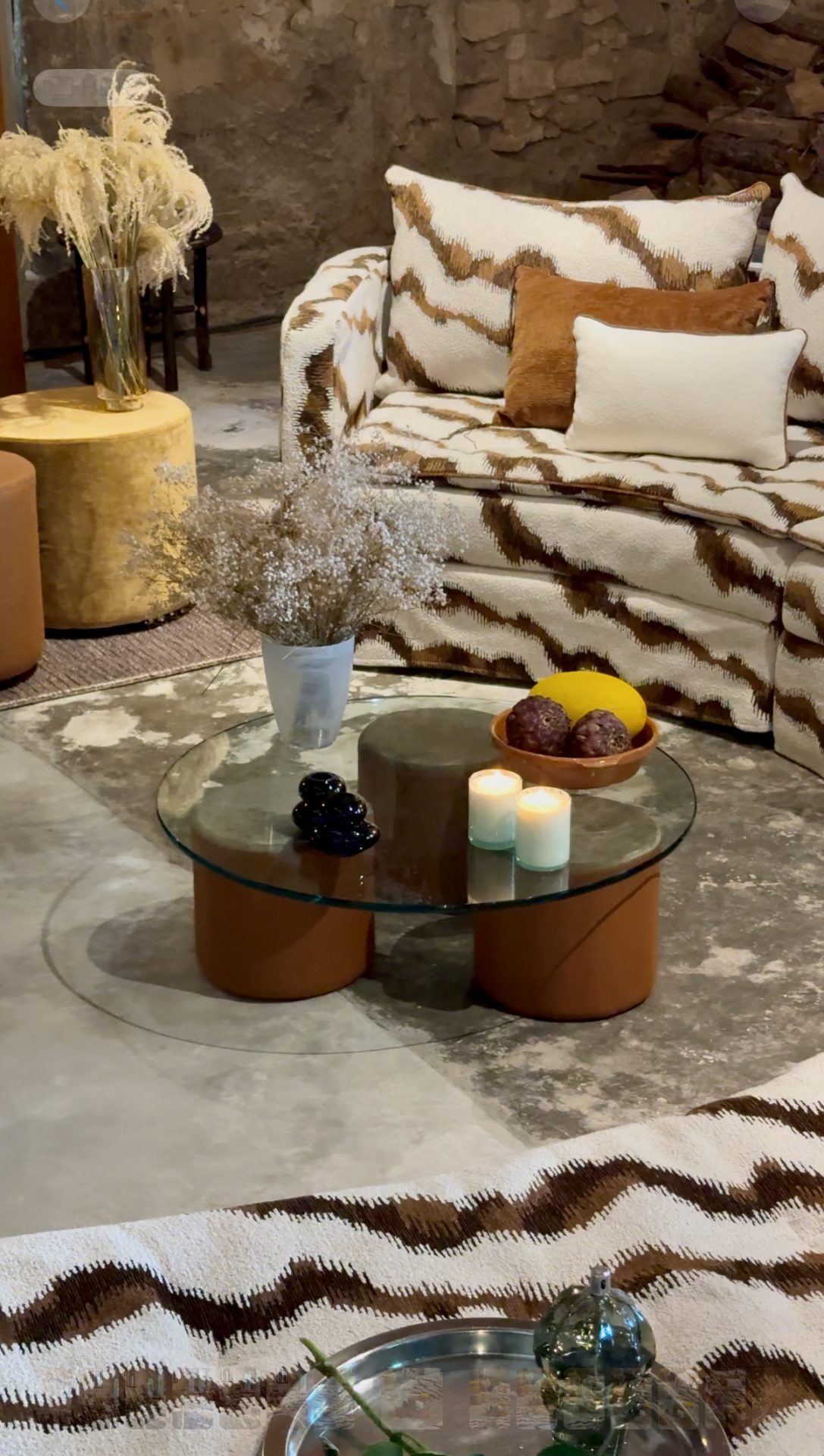 Chaque pied devient une colonne textile, sculptée dans la couleur, formant un lien visuel et tactile avec le reste de l’espace dans lequel le verre laisse le velours s’exprimer.