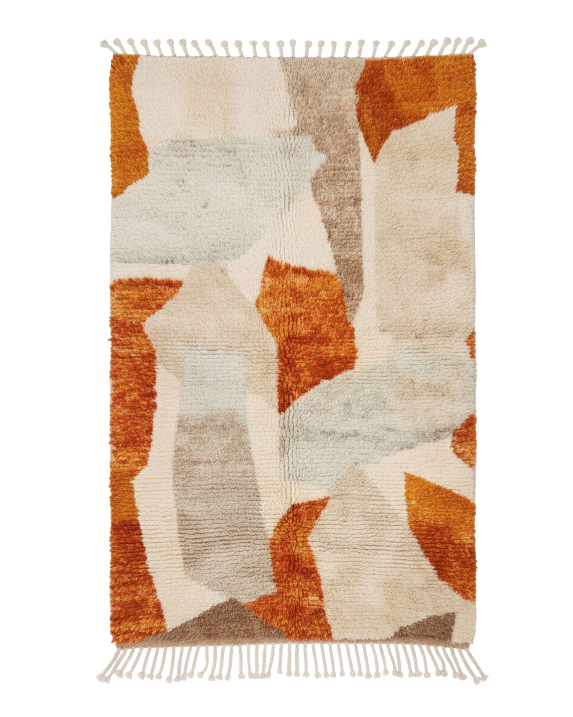 Ce tapis Mrirt se distingue par une composition plus libre et lumineuse, où les formes semblent se fondre les unes dans les autres comme une peinture abstraite. Les nuances d’écru, de beige et de terracotta créent un jeu de contrastes subtil, entre douceur minérale et chaleur enveloppante.